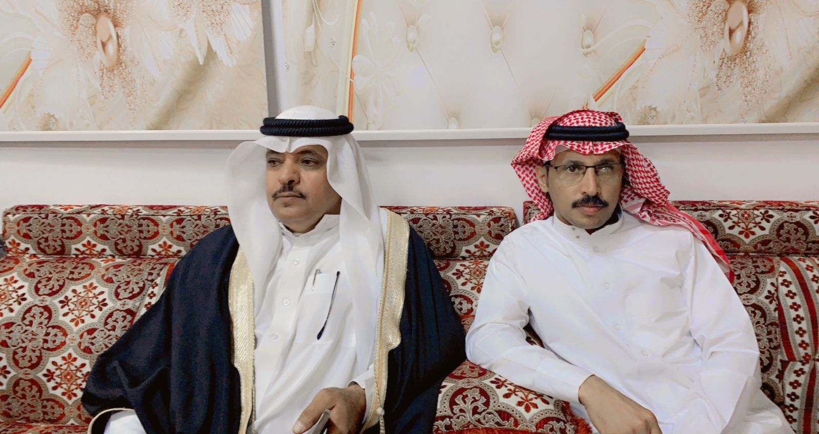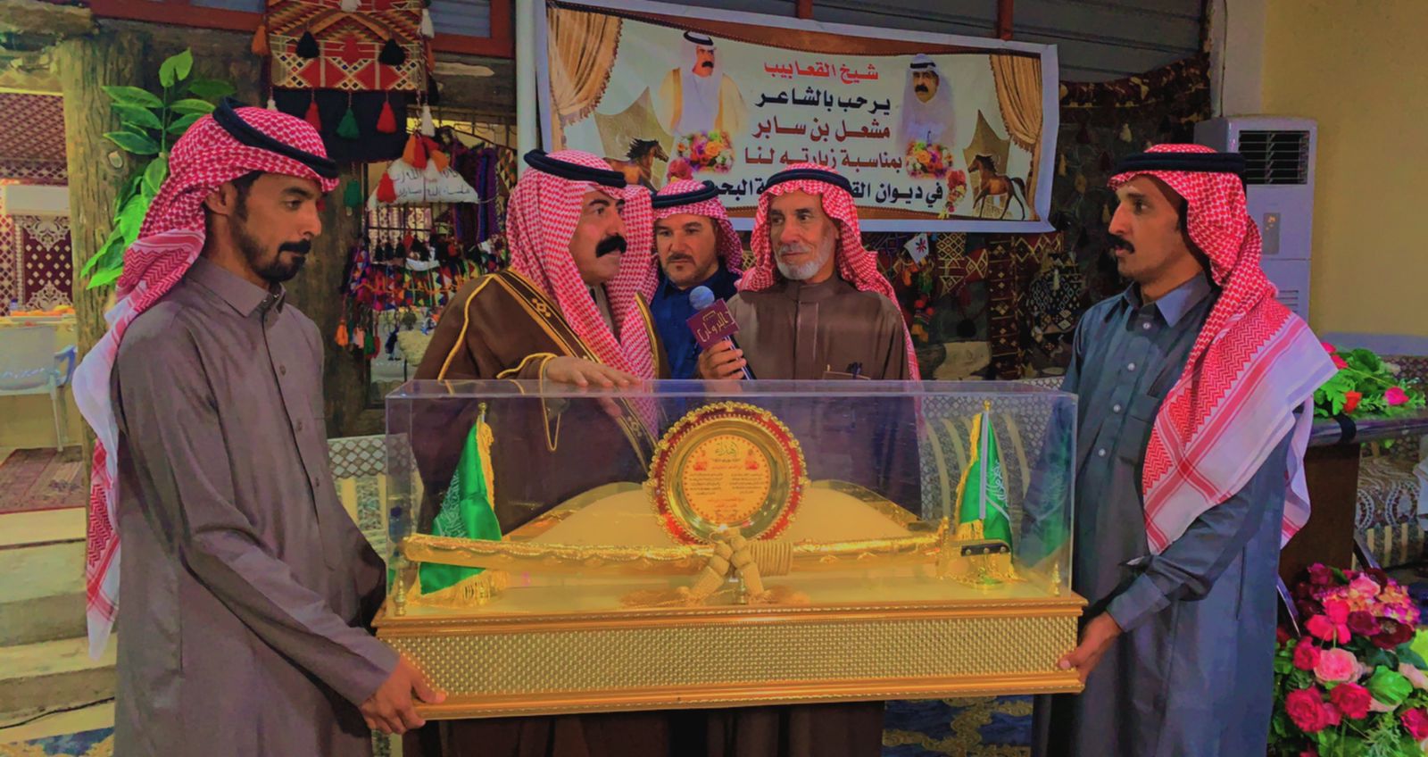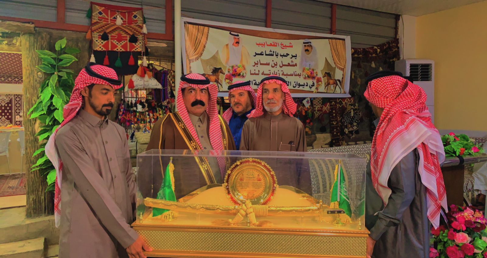 في ضيافة واستقبال حاتمي مبهج بروائح الورد والبخور والطيب ، استقبل الشيخ/ قعيد بن قعبوب معرف قرية البحرة في ديوان القعابيب الشاعر الجزل المعروف /مشعل بن ساير القحطاني .