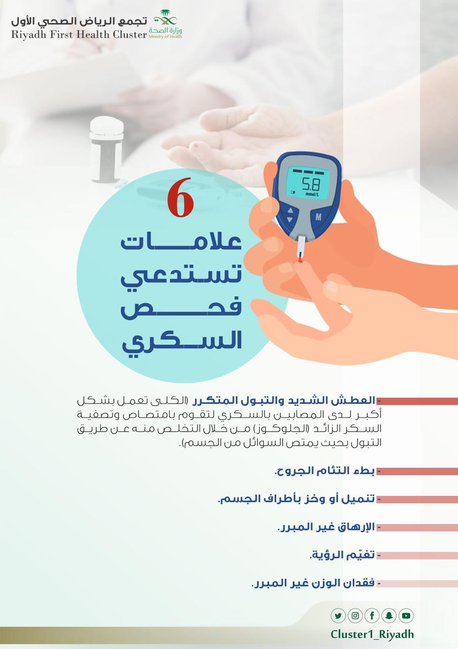 وأشار “التجمع الأول” أن لداء السكري 6 علامات تستدعي الفحص؛ وهي العطش الشديد والتبول المتكرر، وبطء التئام الجروح، ووجود تنميل أو وخز بأطراف الجسم، والإرهاق الغير مبرر، وتغيّم الرؤية وعدم الوضوح، بالإضافة إلى فقدان الوزن المفاجئ.