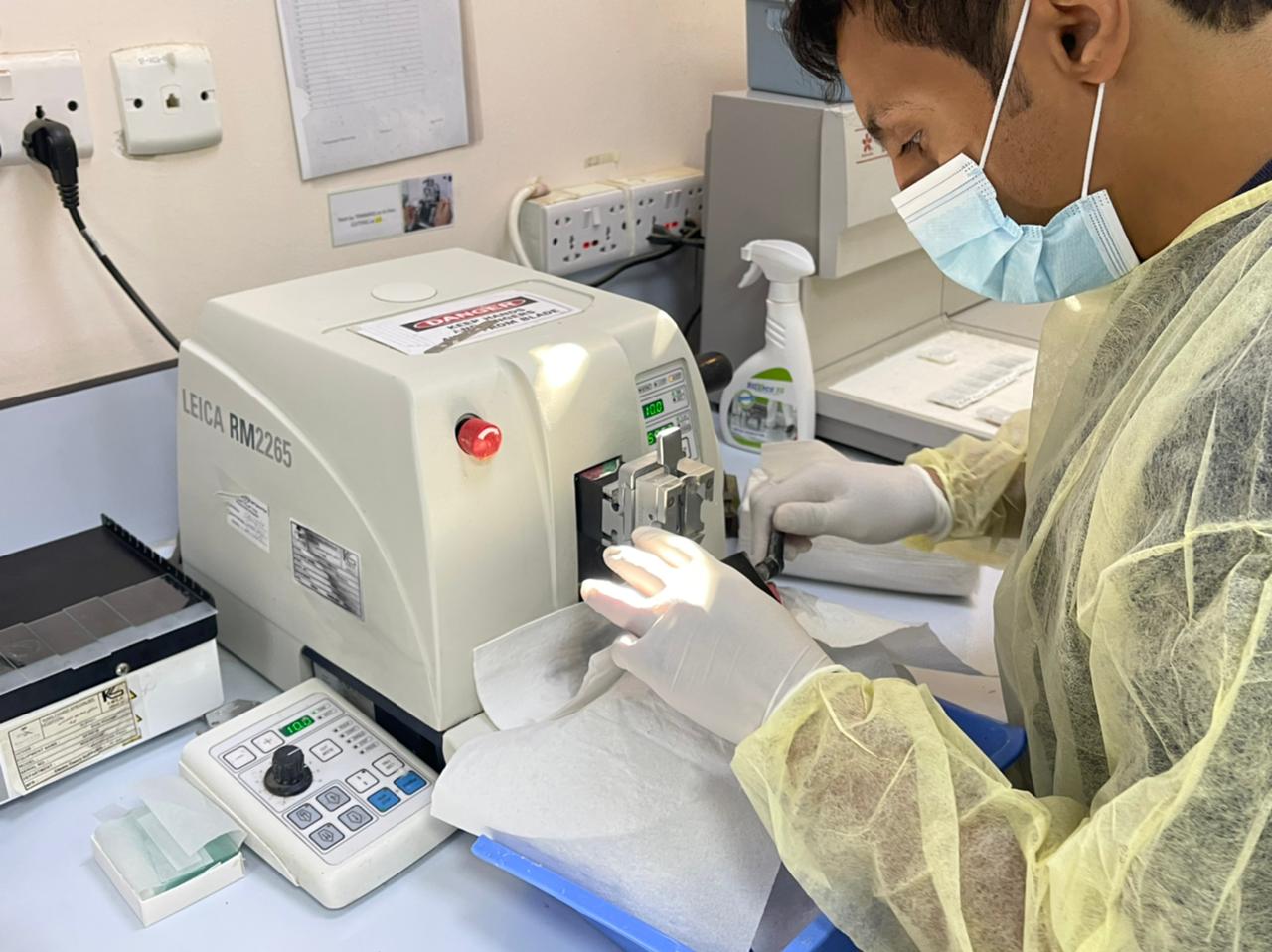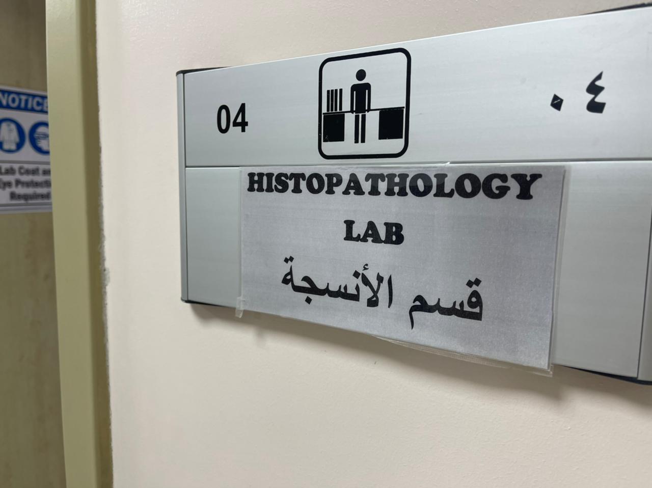 ويضم القسم مختبراً لعلم الأنسجة، يتم تحليل العينات النسيجية والخلايا ويتم عرضها على مجموعة من الأطباء الأكثر كفاءة في علم الأمراض ليتم تشخيصها وإعطاء النتائج بزمن قياسي لا يتجاوز الساعة ، وقد تم تجهيزه بأحدث الأجهزة المخبرية المتطورة ويجري جميع الفحوصات المتعلقة بالأنسجة، والخلايا منها القطع الجليدي (Frozen section) أثناء العمليات وجهاز الكشف عن دلالات الأورام (Immuno-stainer) التي تساعد في تشخيص الحالات الحميدة أو الخبيثة منها , كما تتوفر عيادة للفحص مجهزة بأحدث التجهيزات التشخيصية يعمل بها نخبة من الكوادر الطبية والفنية المؤهلة .