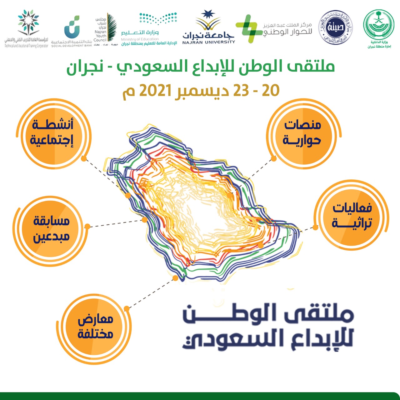نجران تفتح أبوابها لاستقبال حدث آخر للتميز في شهر ديسمبر المقبل، إنه ملتقى الوطن للإبداع السعودي الذي يلتئم عبر شراكة سباعية تضم جائزة الأميرة صيتة بنت عبد العزيز للتميز في العمل الاجتماعي، وجامعة نجران، ومركز الملك عبدالعزيز للحوار الوطني فرع نجران، بجانب إدارة تعليم المنطقة، ومجلس شباب نجران وبنك التنمية ومنشات وذلك برعاية كريمة من أمير المنطقة الامير جلوي بن عبد العزيز بن مساعد.