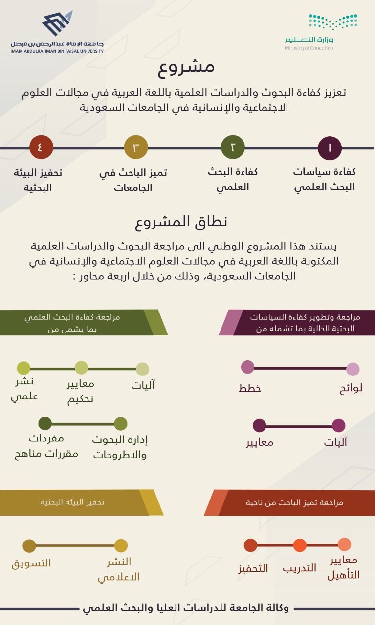 بدورها أفادت عميدة كلية الآداب رئيسة المشروع د. مشاعل بنت علي العكلي أن المشروع يستند على ثلاثة محاور تتمثل في مراجعة وتطوير السياسات البحثية الحالية إلى جانب مراجعة كفاءة البحث العلمي إضافة إلى مراجعة تميز الباحث من ناحية التأهيل، التدريب، والتحفيز وذلك بدعم من معالي رئيس جامعة الإمام عبد الرحمن بن فيصل أ.د. عبد الله بن محمد الربيش و على ضوء ذلك شكّل سعادة وكيل الجامعة للدراسات العليا والبحث العلمي المشرف على المشروع أ.د. فهد بن أحمد الحربي لجنة رئيسية للمشروع تترأسها سعادة عميدة كلية الآداب د. مشاعل بنت علي العكلي تنبثق منها ثلاثة لجان فرعية تعمل على إعداد وتنفيذ خطة تسهم في تحقيق الرؤى والتطلعات تماشيًا مع أهداف التنمية المستدامة ذات البعد التعليمي والاجتماعي وأهداف رؤية المملكة 2030 الاستراتيجية.
