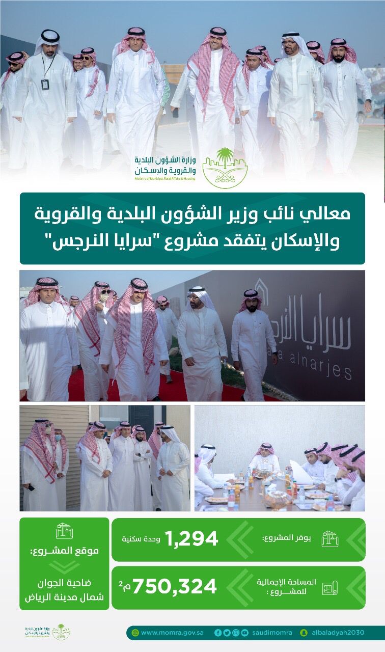 تفقد معالي نائب وزير الشؤون البلدية والقروية والإسكان المهندس عبدالله بن محمد البدير، اليوم، مشروع سرايا النرجس السكني الواقع بضاحية الجوان شمال مدينة الرياض، بهدف الاطلاع على سير الأعمال الإنشائية وتقدم وتيرة البناء في كافة عمليات التطوير التي تقوم بها شركة دار وإعمار لمستفيدي برنامج سكني بهدف زيادة نسبة تملك الأسر السعودية للمساكن، تحقيقاً لمستهدفات برنامج الإسكان – أحد برامج رؤية المملكة 2030 -.