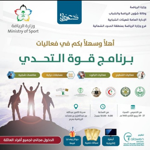 نظم فرع وزارة الرياضة بمنطقة الحدود الشمالية وتحت إشراف وكالة شؤون الرياضة والشباب، ممثلة بالإدارة العامة للهيئات الشبابية، يوم الخميس، برنامج “قوة التحدي” والذي سيقام بمدينة الأمير عبدالله بن عبدالعزيز بن مساعد الرياضية بمدينة عرعر، وبمشاركة عدد من الدوائر والقطاعات الحكومية و العسكرية والخاصة بالمنطقة.