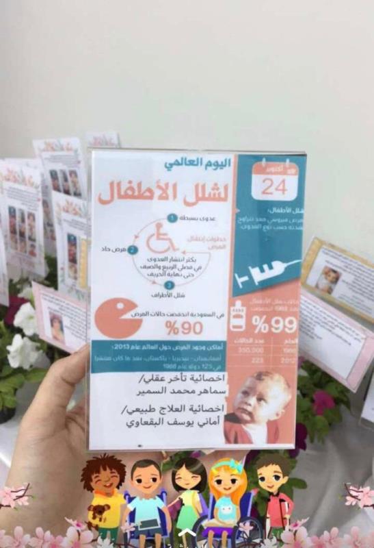 نفّذ مركز براعم التحدي للرعاية النهارية لذوي الإعاقة بمقر المركز يوم الأربعاء 15 صفر 1440هـ #اليوم_العالمي_لشلل_الأطفال حيث تم تنفيذ البرنامج في فصل الإعاقات المزدوجة بالمشاركة مع أطفاله ، حيث قدمت عددٌ من البرامج و الفعاليات المتنوعة ، و اشتمل البرنامج على تقديم عرض مرئي نفذته اخصائية العلاج الطبيعي للأطفال و رئيسة مجموعة سبتا للأطفال بالمملكة الأستاذة نجوى خان ، حيث كان مضمونه التوعية و التثقيف بأسباب الشلل و كيفية الوقاية منه .