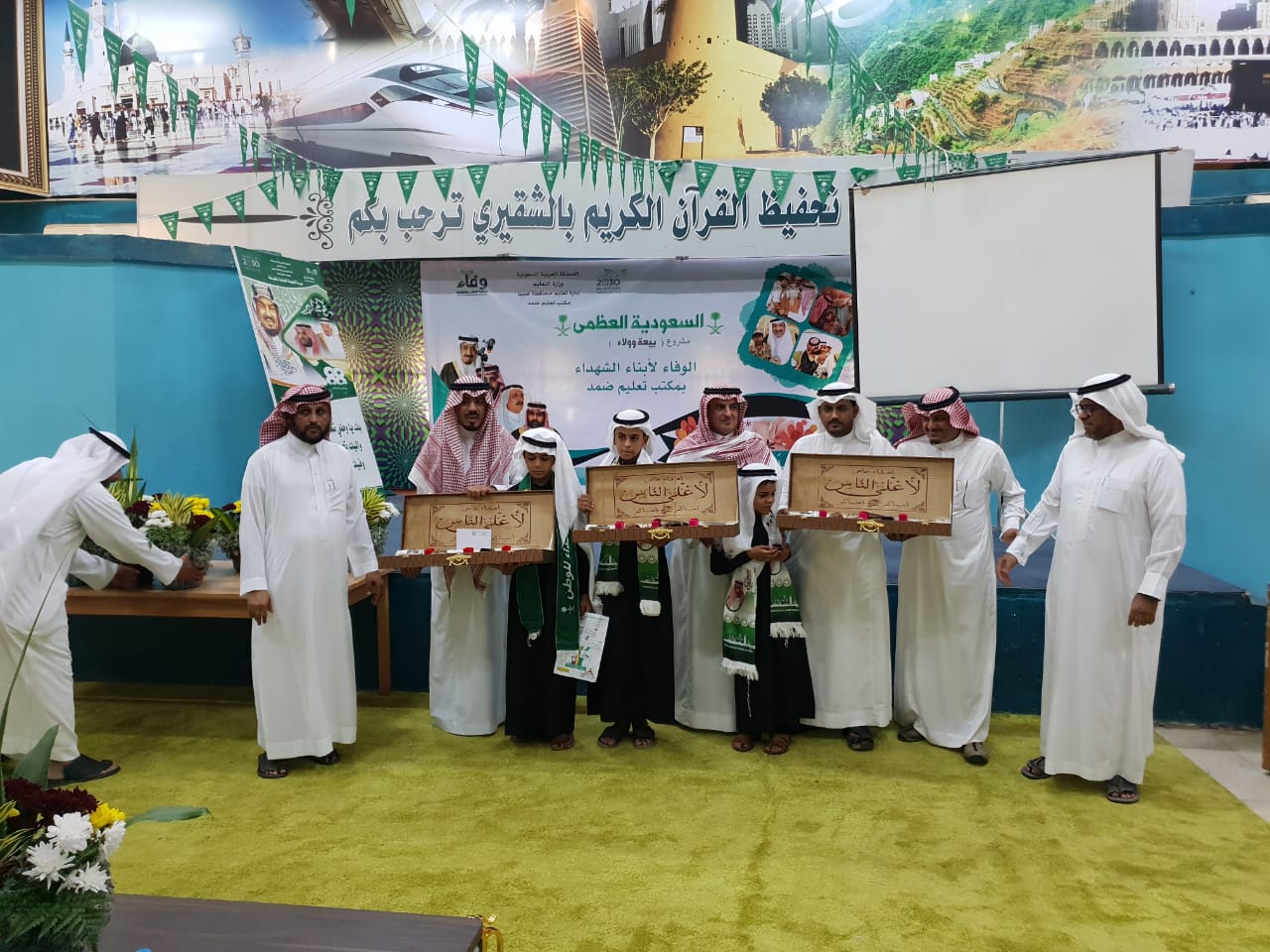 نفذ برنامج وفاء بمكتب تعليم ضمد برنامج الوفاء لأبناء الشهداء بدأ الحفل بالنشيد الوطني ثم تلاوة من كتاب الله رتلها الطالب نايف مطمي من ثانوية الشقيري ثم كلمة مشرف برنامج وفاء بمكتب تعليم ضمد الأستاذ علي بن محمد خواجي تحدث فيها عن ثلاثة محاور الشهادة والشهداء والواجب لأبناء الشهداء ثم التعريف ببرنامج وفاء أهدافه وبرامجه بعد ذلك قصيدة رائعة ومميزة للطالب عبداللطيف شبير من مدرسة تحفيظ الشقيري بعنوان ابن الشهيد ثم عرض مرئي عن الاعتزاز بالشهداء من إعداد مشرف البرنامج بعد ذلك حوار في قمة الروعة قدمه الطلاب أحمد زين العابدين وخالد حسين قصير من تحفيظ ضمد المتوسطة ثم كلمة أبناء الشهداء قدمها الطالب عبدالعزيز شويعي من مدرسة ابي فراس المتوسطة