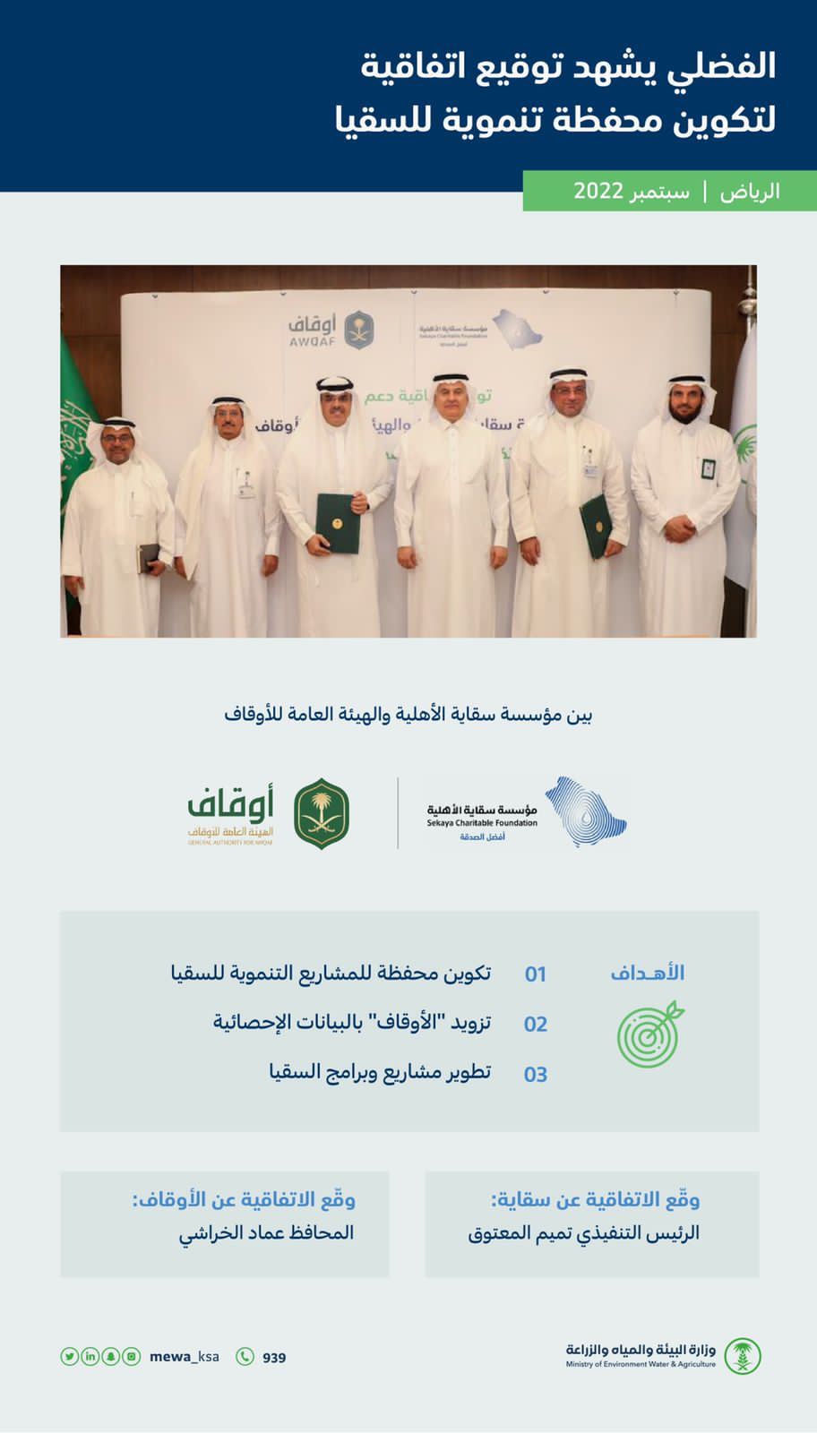 شهد معالي المهندس عبد الرحمن بن عبد المحسن الفضلي وزير البيئة والمياه والزراعة رئيس مجلس أمناء مؤسسة سقاية الأهلية، توقيع مذكرة دعم بين مؤسسة سقاية الأهلية والهيئة العامة للأوقاف، بغرض تكوين محفظة للمشاريع التنموية للسقيا، بناءً على البيانات الإحصائية للاحتياج المائي والدراسات والأبحاث الخاصة بمجال السقيا، وتصميم وتطوير المشاريع المتعلقة بها.