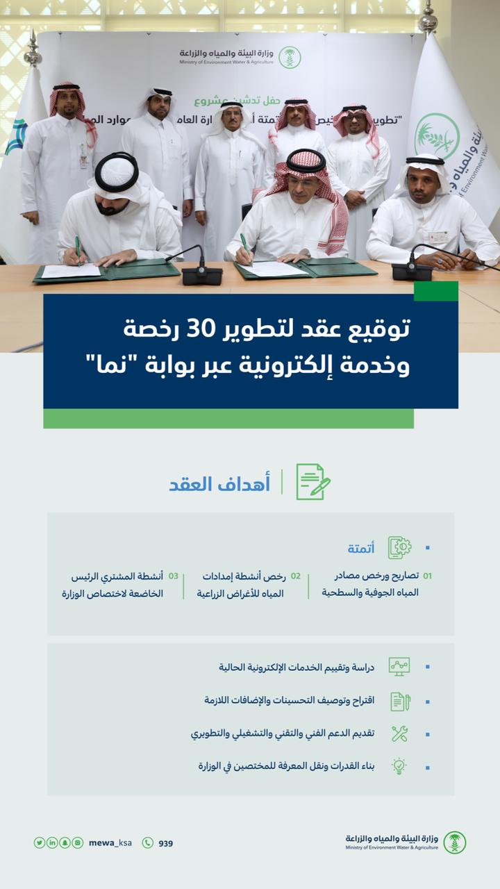 وأوضحت الوزارة، أن توقيع العقد يهدف إلى تنفيذ مشروع التحول الرقمي، وأتمتة تصاريح ورخص مصادر المياه الجوفية والسطحية واستخداماتها وتنميتها، ورخص أنشطة إمدادات المياه للأغراض الزراعية، وأنشطة المشتري الرئيس الخاضعة لاختصاص الوزارة، ضمن بوابة “نما”.