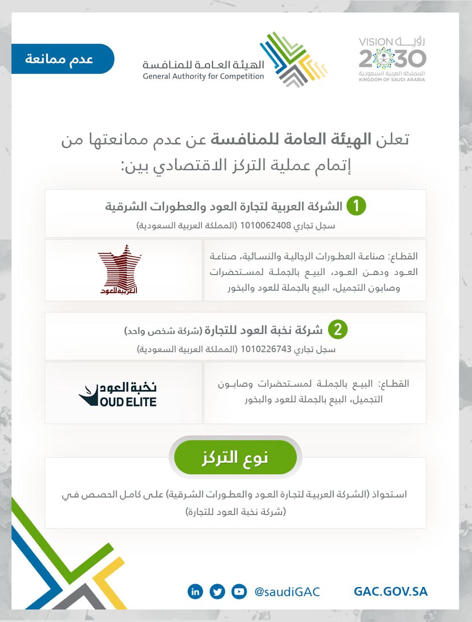 أعلنت الهيئة العامة للمنافسة عبر بيان رسمي اليوم عدم ممانعتها على عملية استحواذ (الشركة العربية لتجارة العود والعطورات الشرقية) على(شركة نخبة العود للتجارة). وأفادت الهيئة العامة للمنافسة بأنها عرفت البعد السلعي للصفقة بسوق العطور الشرقية والعود. وعرفت الهيئة النطاق الجغرافي للصفقة بالنطاق الاقليمي بسبب زيادة انتشار وسائل التواصل الاجتماعي و الاتجاه المتزايد لتجارة التجزئة عبر الانترنت والمعارض المقامة في المنطقة. وعليه قامت الهيئة بدراسة سوق العطور الشرقية والعود في المنطقة لتحديد ما إذا كانت هناك مخاوف على المنافسة من عدمها. وخلصت دراسة الهيئة أنه لا يتوقع أن يكون هناك مخاوف تؤثر على المنافسة في المملكة العربية السعودية بسبب أن سوق العطور سوق ذو نمو عالي و طلب متزايد كما يؤدي انخفاض حواجز الدخول في سوق التجزئة إلى زيادة الضغط التنافسي في هذا القطاع. وحسب إفادة الهيئة العامة للمنافسة، بأن التعاملات بين أطراف الصفقة قليلة و منحصرة في بعض الأعواد والزيوت العطرية، ولعدم تكامل أي من الشركتين رأسياًّ مع الشركات المنافسة (عدم قيامها بالتصنيع أو التوزيع للغير) لن تؤثر الصفقة سلباً على سلاسل الإمداد للمشاركين في السوق مما يؤدي إلى الاضرار بالمنافسة أو الضغط على المتنافسين. واختتمت الهيئة بيانها بأن المتاجر التقليدية والمتاجر الإلكترونية والمتاجر الأجنبية التي لديها خط عطور شرقية تعد قيداً تنافسيا على الأطراف المعنية حيث تقدم منتجات مماثلة مما لا يظهر أي قيود على مرونة الأحد