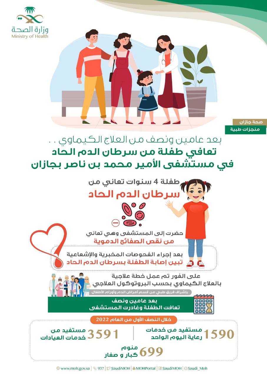 قالت صحة جازان أن فريقاً طبيًا بمستشفى الأمير محمد بن ناصر تمكن من إنهاء معاناة طفلة تبلغ من العمر ٤ سنوات من سرطان الدم الحاد ولله الحمد.