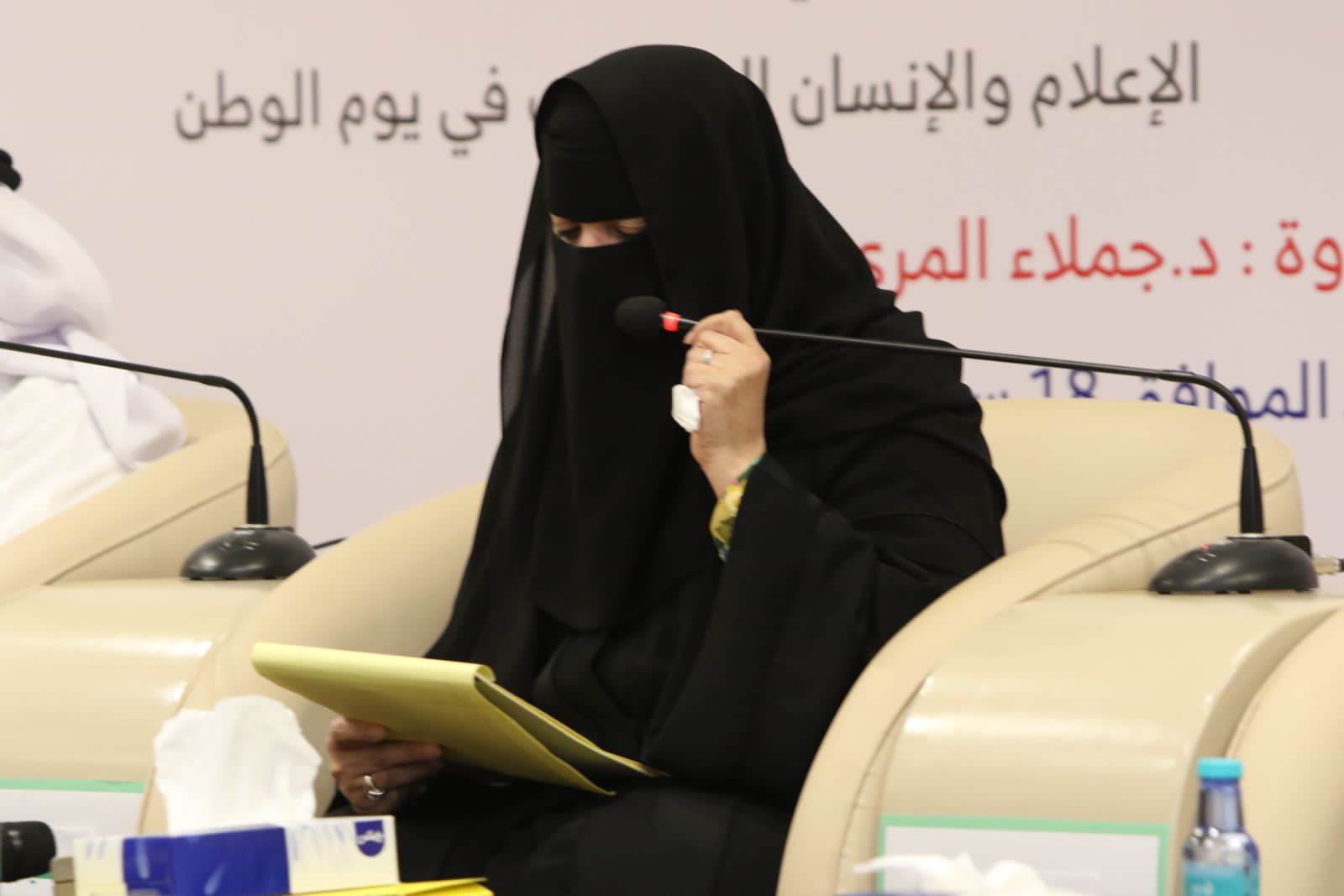 في حين تطرقت د.منال المحيميد لإسهامات الأدب والثقافة في تعزيز الهوية الوطنية وقالت ” للمؤسسات الثقافية دور بارز في تحقيق الركائز الاستراتيجية الثلاث لرؤية المملكة، المتمثلة في بناء: مجتمع حيوي، اقتصاد مزدهر، وَ وطن طموح ، و شهدنا مؤخرا دور المؤسسات الثقافية بكل مجالاتها ورأينا جهدها في فتح آفاق الحوار الثقافي مع العالم من خلال الاعتزاز بالتراث السعودي ، و النتاج الأدبي الوطني في الشعر السعودي تجاوز بغزارته ما أنتج في العقود الماضية ، و الذات الوطنية عند الأدباء السعوددين تجلت في حديثها عن: المناسبات، الفخر الخالص، القيادات، المنجزات ، قدسية المكان، التاريخ، الحاضر المزدهر، الحنين ، و بعدما وجدت الرؤية؛ وربانها الشاب الجرئ ولي العهد الأمير محمد بن سلمان ورجال نذروا أنفسهم لتوحيد الجبهة الاعلامية.
