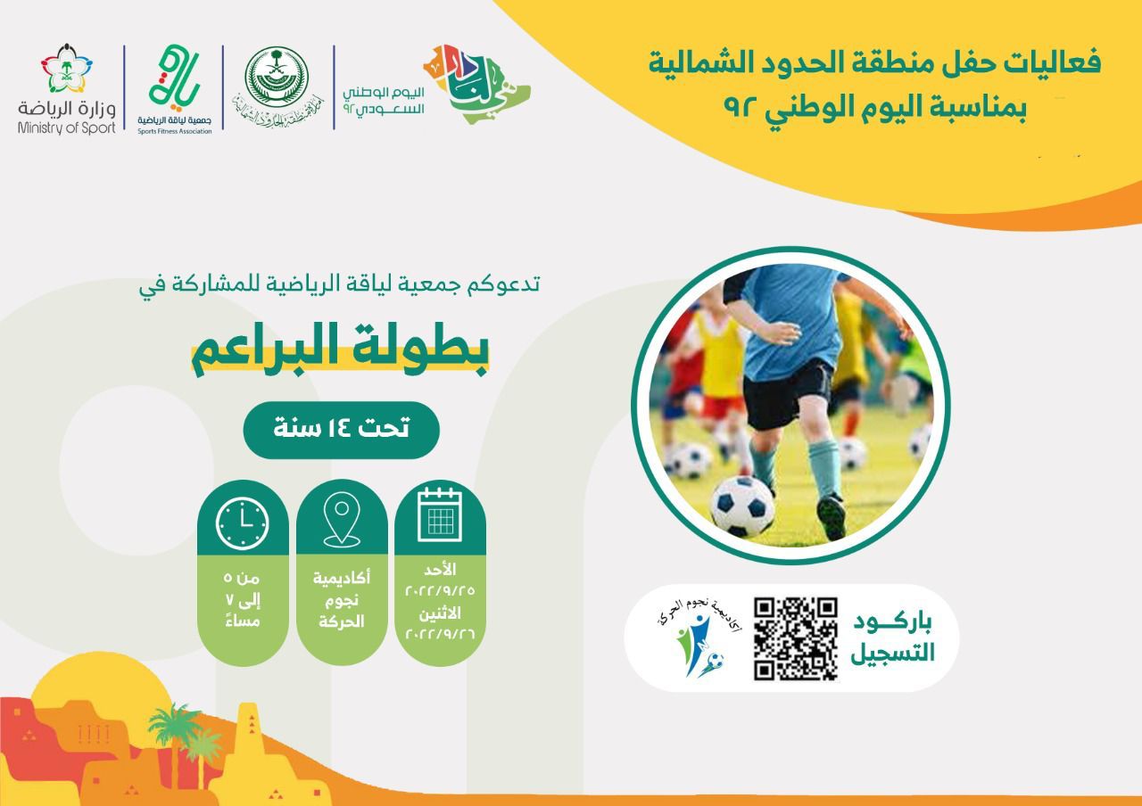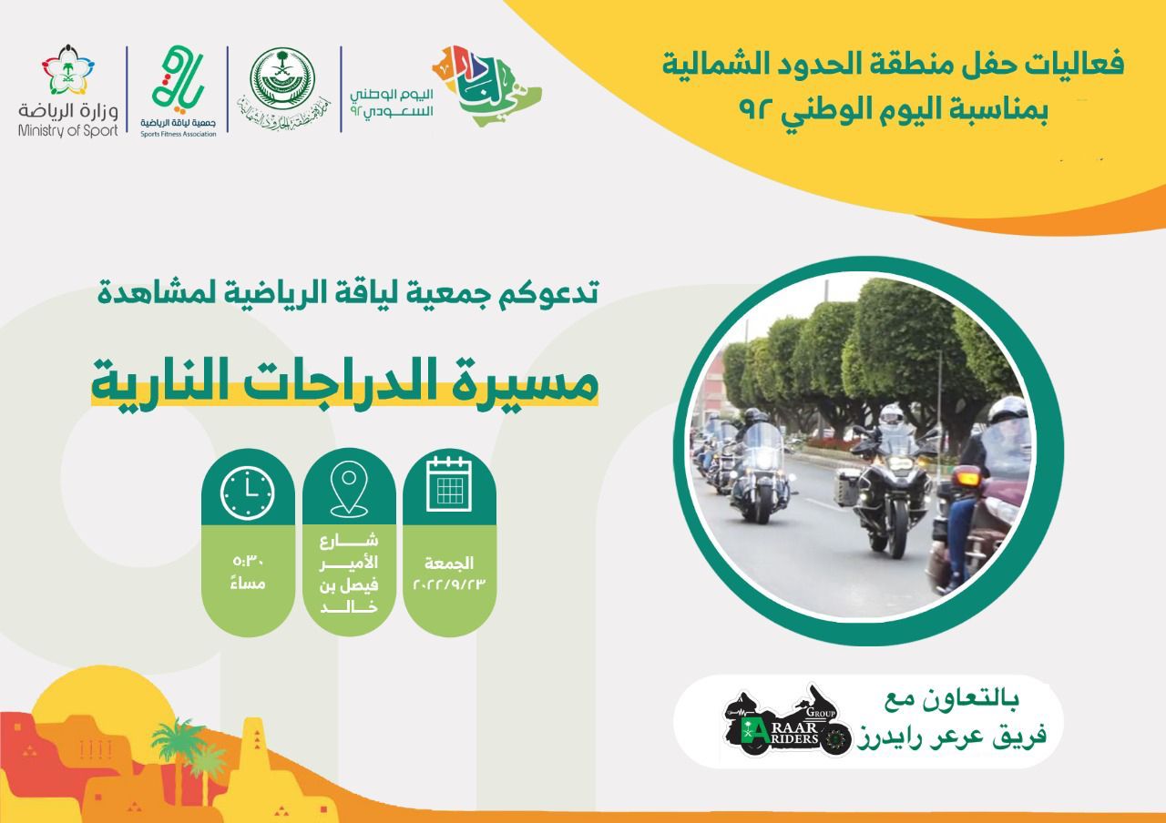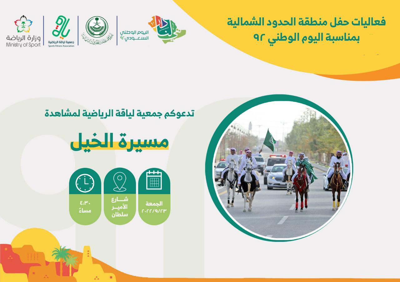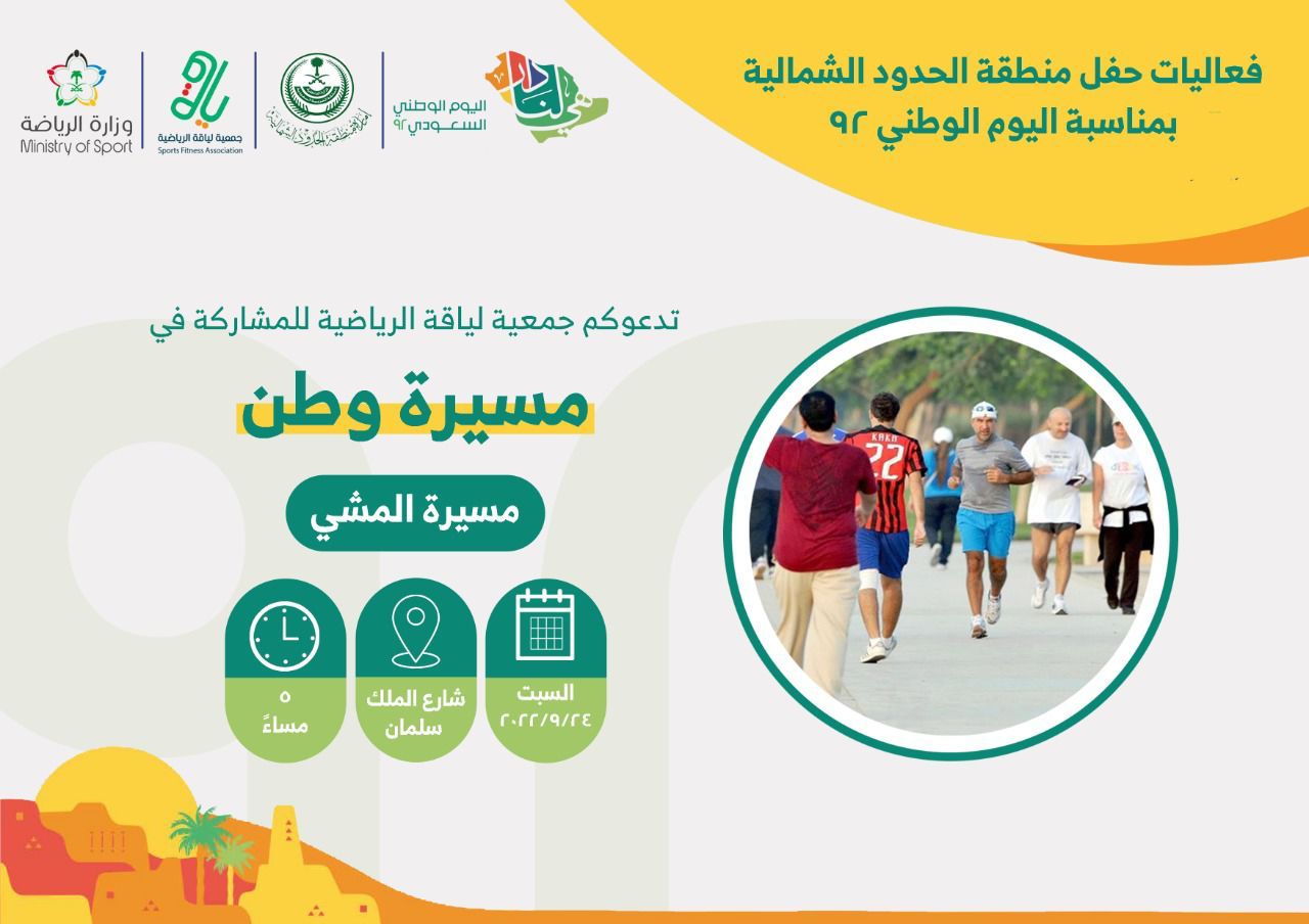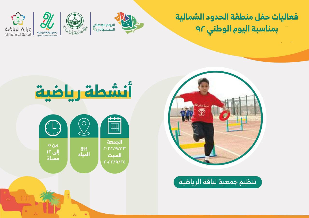 اطلقت فعاليات الحدود الشمالية بمناسبة “اليوم الوطني 92 “ تحت شعار “هي لنا دار ” فعاليات وبرامج رياضية تهدف إلى إشراك كافة فئات المجتمع ،وتعزز الانتماء إلى وطنهم الغالي ،تماشياً مع تطلعات القيادة الرشيدة في تحقيق الأهداف رؤية المملكة العربية السعودية ” 2030 ” .