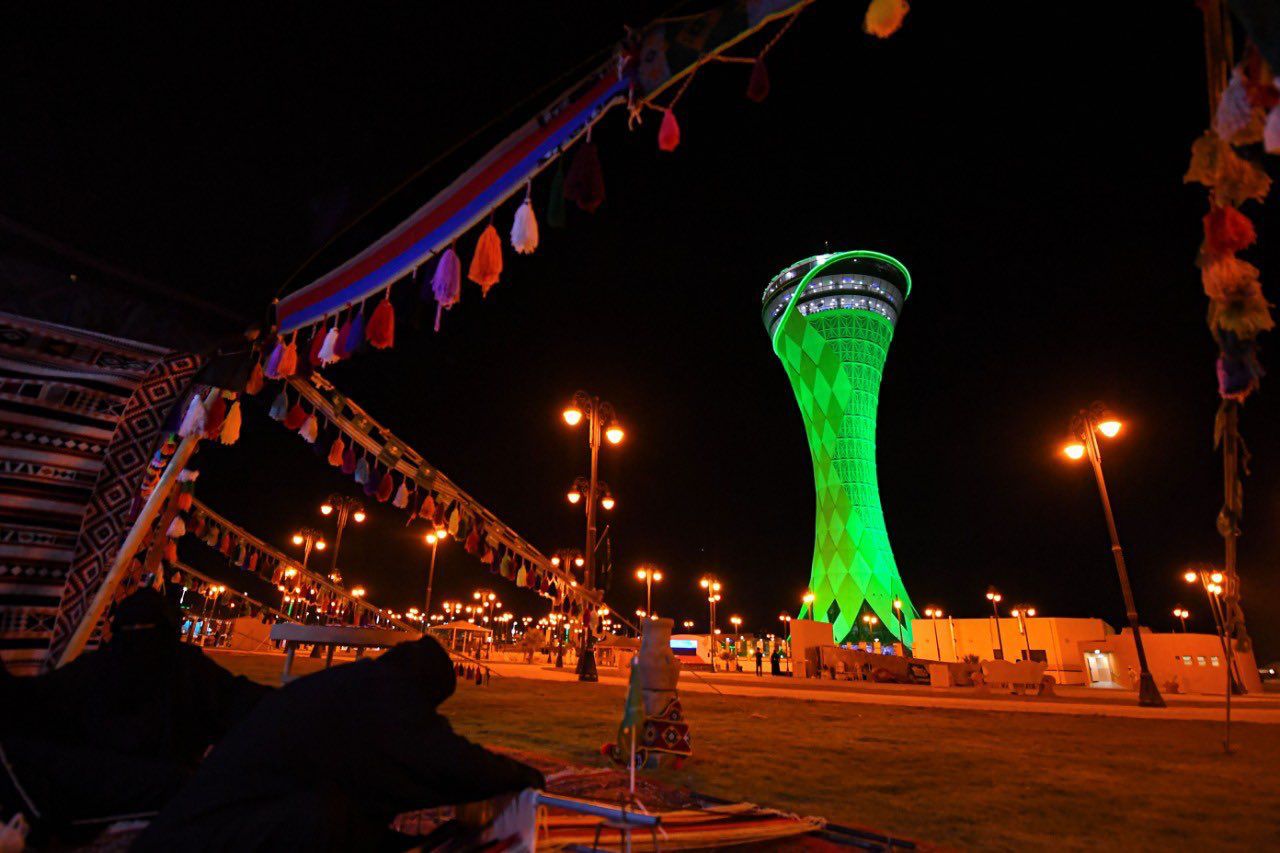 اكتسى برج مياة عرعر المعلم العمراني والحضاري الابرز بمنطقة الحدود الشمالية باللون الاخضر احتفالاً باليوم الوطني 92 للمملكة والذي يتميز