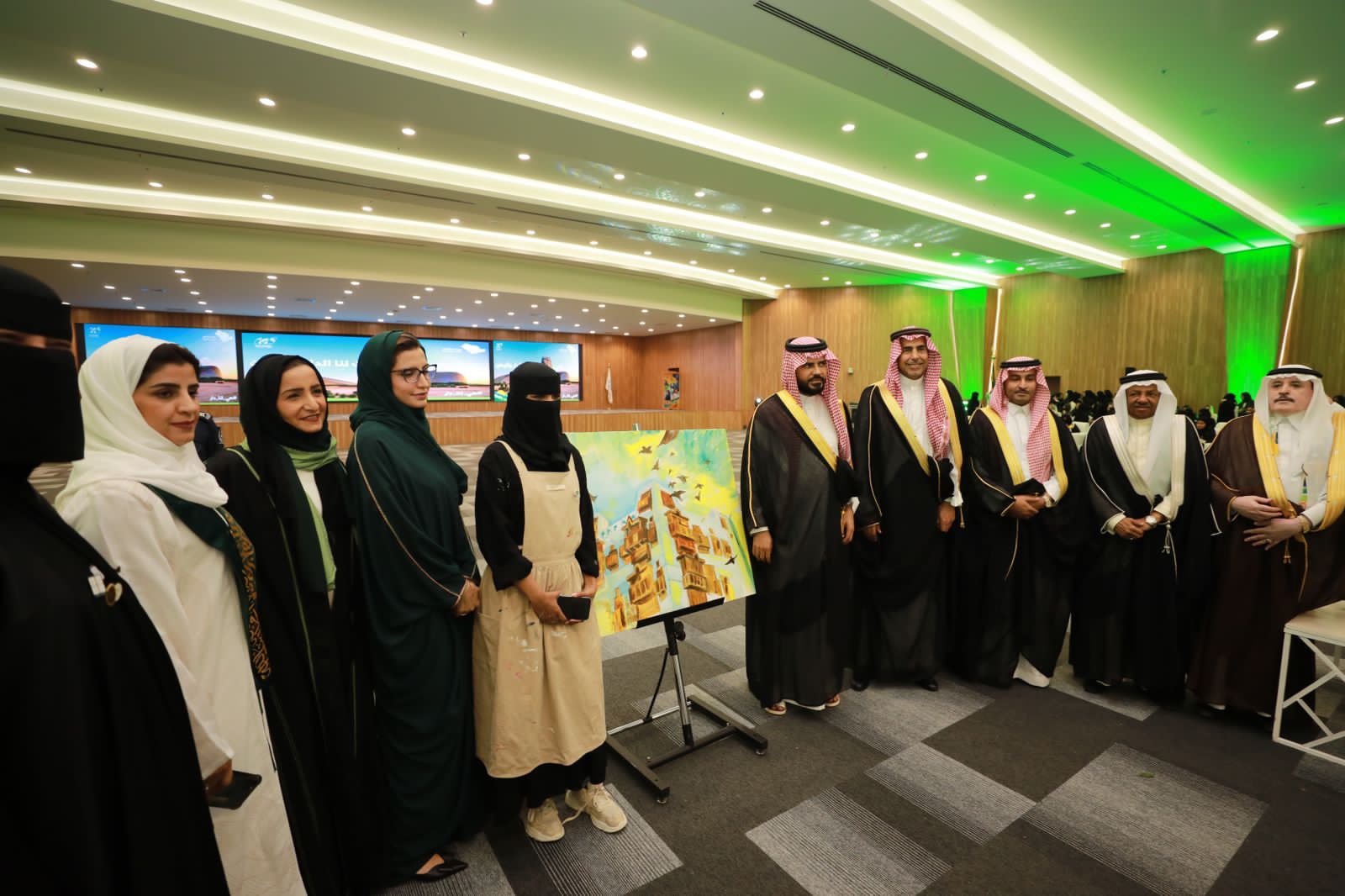 ​تلى ذلك أوبريت فلكلوري بعنوان “المملكة بين الماضي والمستقبل” حيث تظهر في لوحاته المظاهر الاجتماعية والاقتصادية والتعليمية منذ تأسيس المملكة مروراً بعصرنا الحالي وصولاً إلى رؤية المملكة الطموحة ٢٠٣٠. كما شهد الحفل معرضًا مصاحب تخلله ( لوحة أزياء الوطن) لطالبات كلية التصاميم والفنون عبارة عن تصاميم معاصرة مستوحاة من الأزياء التراثية لمناطق المملكة الخمسة بألوان الوطن لتجسد أسمى معاني الفخر والاعتزاز بوطننا، و (رسم حر لوطن حر) لوحة ترسم بأنامل الطالبات لتعبر عن واحدة من أشهر معالم مدينة جدة لتكون ذكرى في يوم ذكرى الوطن 92 .