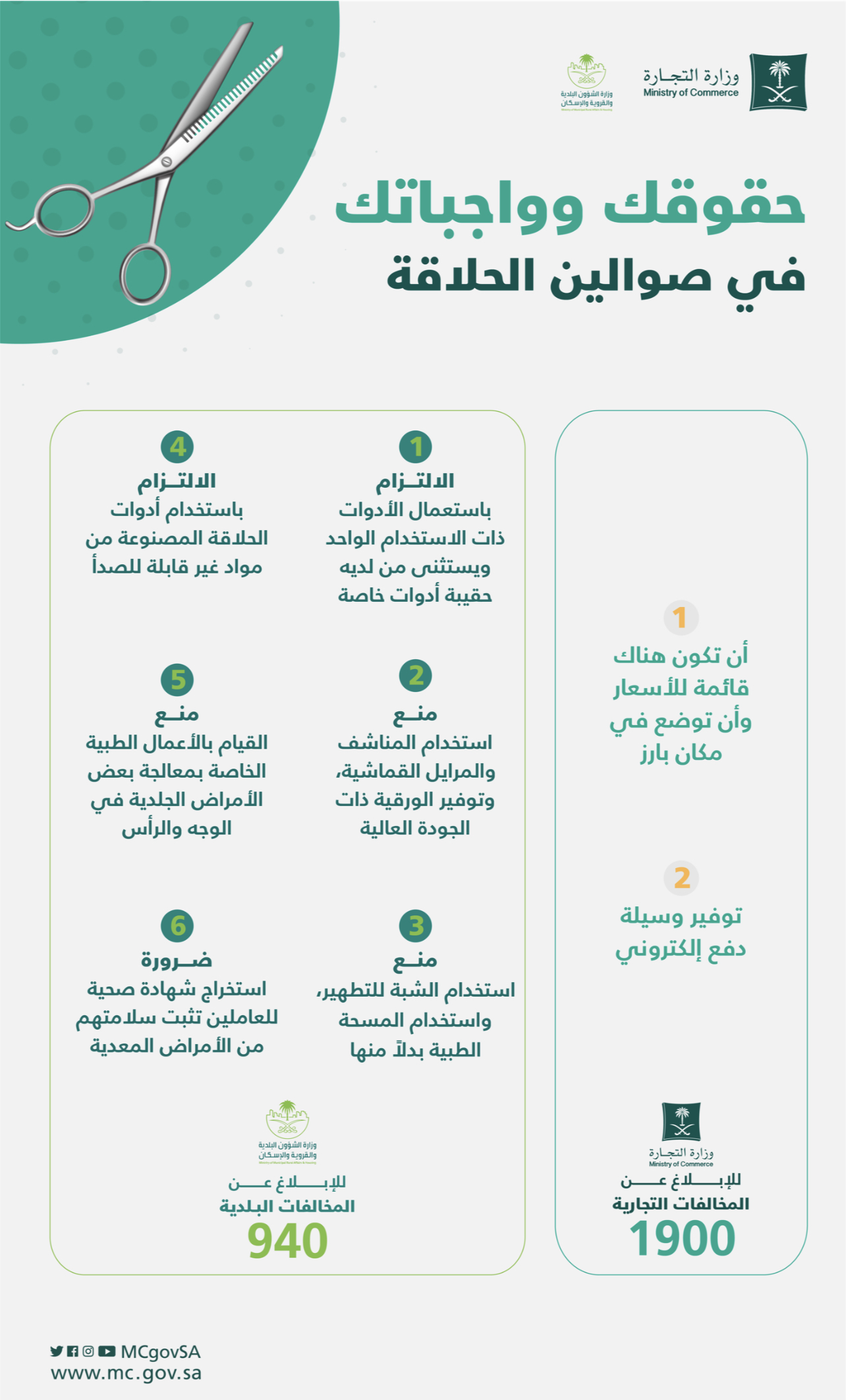 أكدت وزارتا التجارة والبلدية والشؤون القروية والإسكان أهمية التزام صوالين الحلاقة في كافة مناطق المملكة بحقوقها وواجباتها تجاه المستهلك وفقاً للائحة الاشتراطات البلدية لنشاط الحلاقة الرجالية.