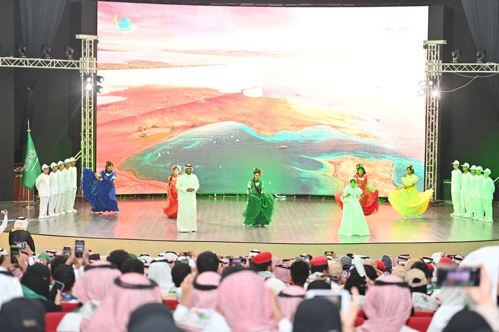 عقب ذلك قُدم أوبريت “حكاية مجد” من خلال 8 لوحات فنية ليحكي ويتحدث عما تعيشه المملكة من نهضة تنموية كبرى على مختلف الأصعدة، والمنجزات المحققة على مستوى العالم، والذي كتب كلماته رئيس النادي الأدبي بجازان حسن صلهبي، وشارك في أداء لوحاته واستعراضاته 46 طالبا وطالبة.