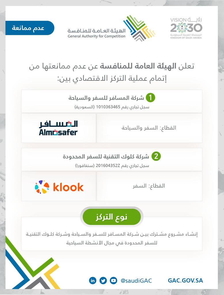 أعلنت الهيئة العامة للمنافسة عبر بيان رسمي اليوم عدم ممانعتها لعملية إنشاء شركة جديدة بين (شركة المسافر للسفر والسياحة) و (شركة كلوك التقنية للسفر المحدودة) لتقديم خدمات الأنشطة السياحية والترفيهية من خلال منصة رقمية لبيع التذاكر. وتعد عمليات المشاريع المشتركة بين الأطراف موجبة للإبلاغ وفقاً لنظام المنافسة ولائحته التنفيذية.