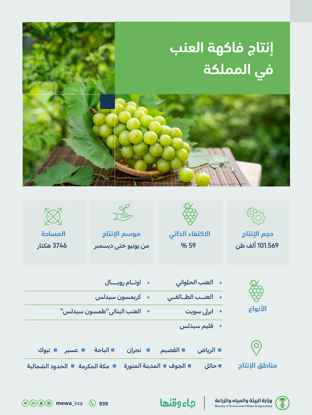 أوضحت وزارة البيئة والمياه والزراعة، أن إنتاج المملكة من العنب يبلغ أكثر من 101.569 ألف طن سنويًّا، من خلال زراعته بعددٍ من المناطق، في مساحة تُقدّر بـأكثر من 3746 هكتار، ليحقق بذلك اكتفاءً ذاتيًّا بنسبة 59%، مشيرة إلى أن العنب يُعدُّ من الفاكهة الاقتصادية الواعدة ذات الربحية العالية، إذ يتميز بوفرة في الإنتاج، ونجاح زراعته في نطاق واسع من أنواع التربة المختلفة، مع قلة احتياجه للمياه نسبيًّا.