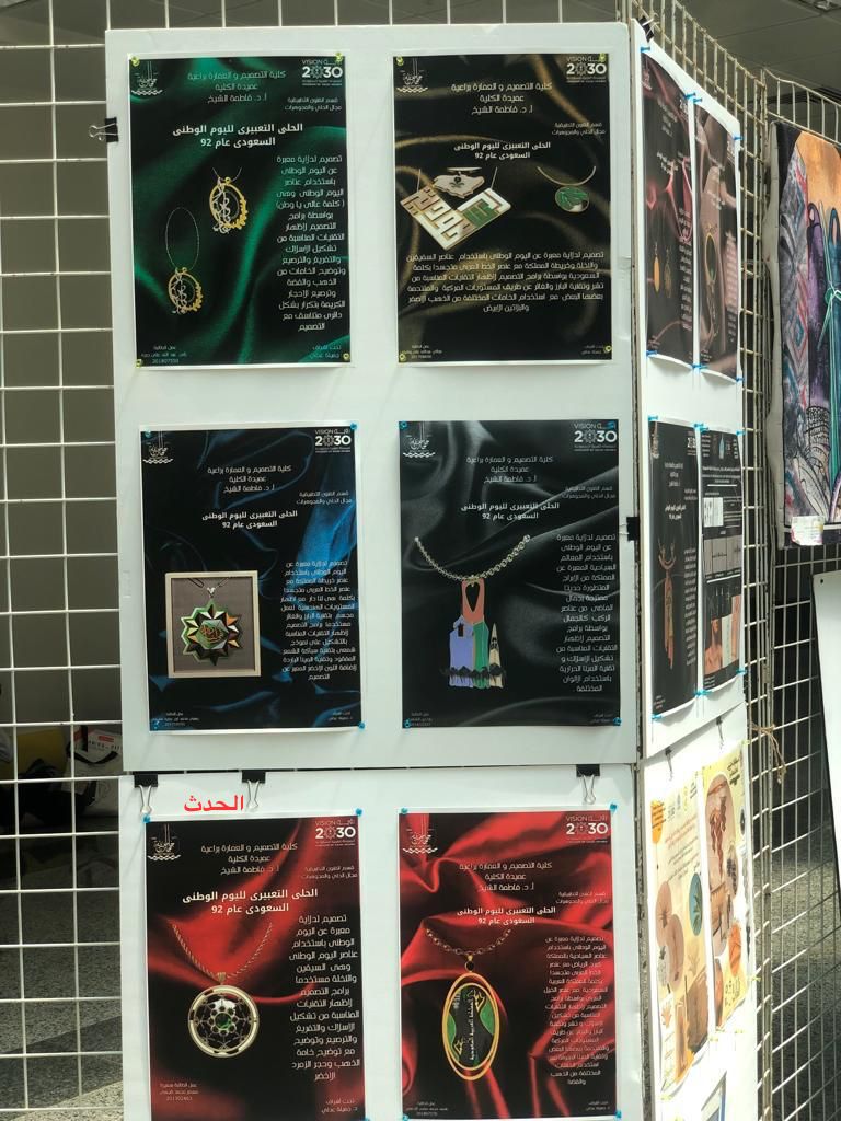 المنتجات المتميزة للمقررات تصميم الحلي والمجوهرات للمصممة غصون الخبراني. ( الحلي التعبيري لليوم الوطني السعودي 92 ) إشراف د . جميلة عدلي مقرر تصميم اثاث قسم الداخلي الطالبة اسيل زيد القرم ( مشروع التراث السعودي )