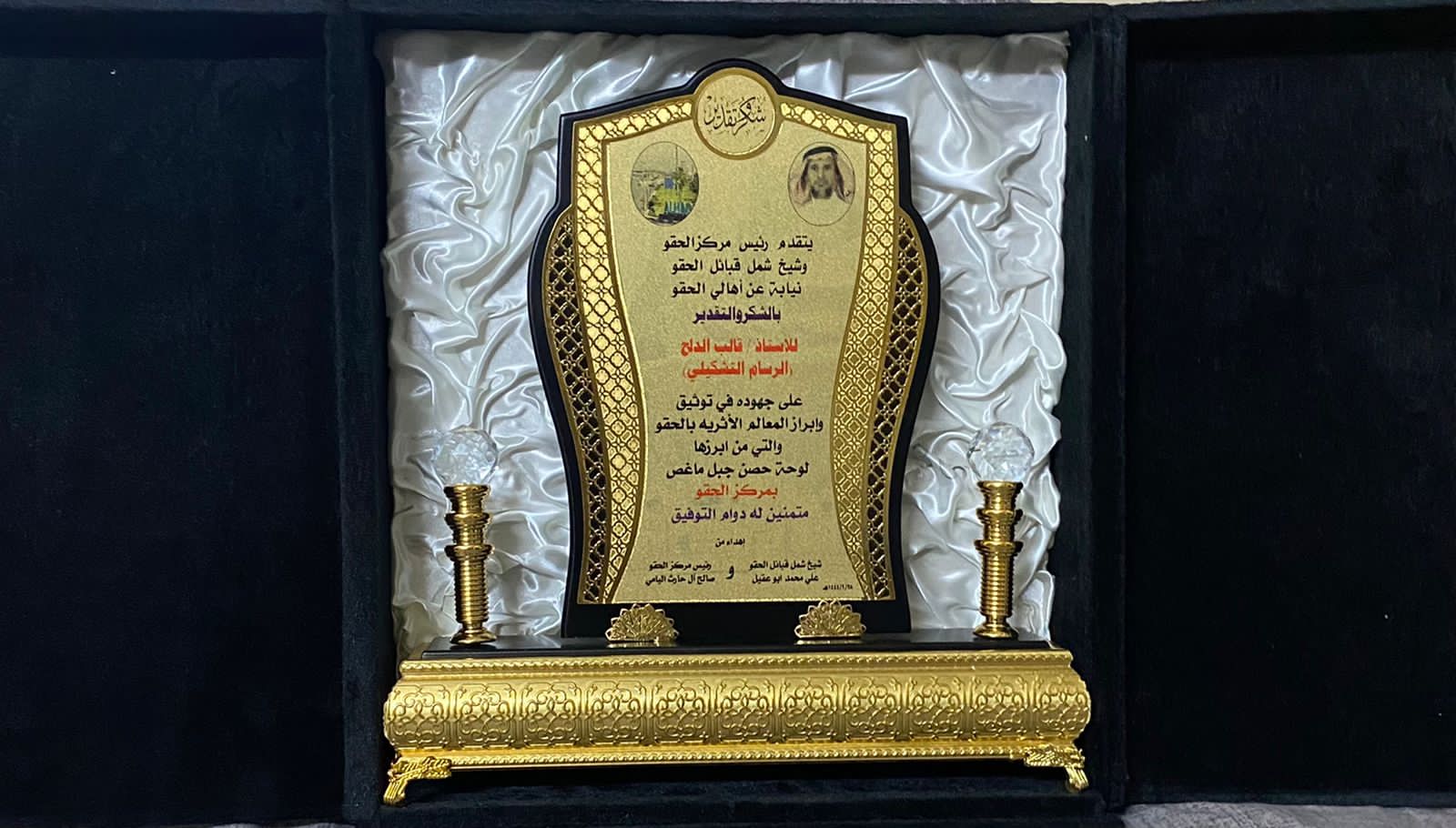 رئيس مركز الحقو ال حارث وشيخ شمل قبائل الحقو يكرمان الفنان التشكيلي قالب الدلح