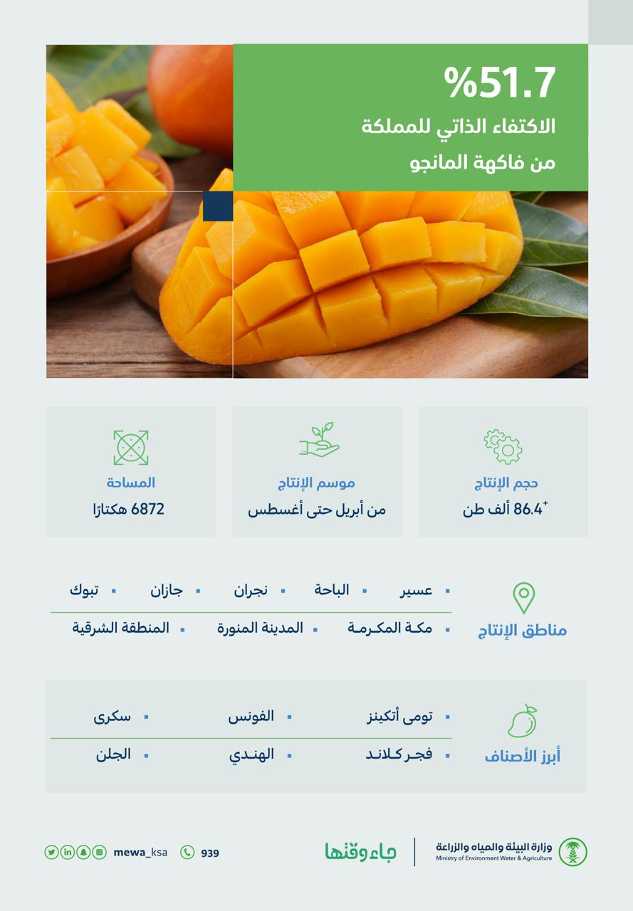 كشف وزارة البيئة والمياه والزراعة، أن المملكة حققت اكتفاءً ذاتيًا من فاكهة المانجو بنسبة بلغت 51.7%، وبإنتاجٍ يتجاوز 86.4 ألف طن سنويًّا، من خلال زراعتها بعددٍ من المناطق، في مساحة تُقدّر بـ 6872 هكتار.