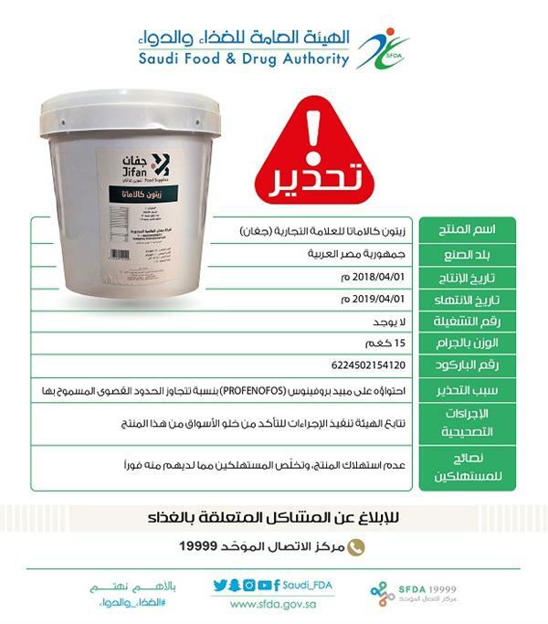 حذّرت الهيئة العامة للغذاء والدواء من شراء أو استهلاك منتج “زيتون كالاماتا” للعلامة التجارية “جفان” المنتج في جمهورية مصر العربية، وذلك لاحتوائه على مبيد بروفينوفوس (PROFENOFOS) بنسبة تتجاوز الحدود القصوى المسموح بها من بقايا المبيدات في المواصفات المعتمدة.
