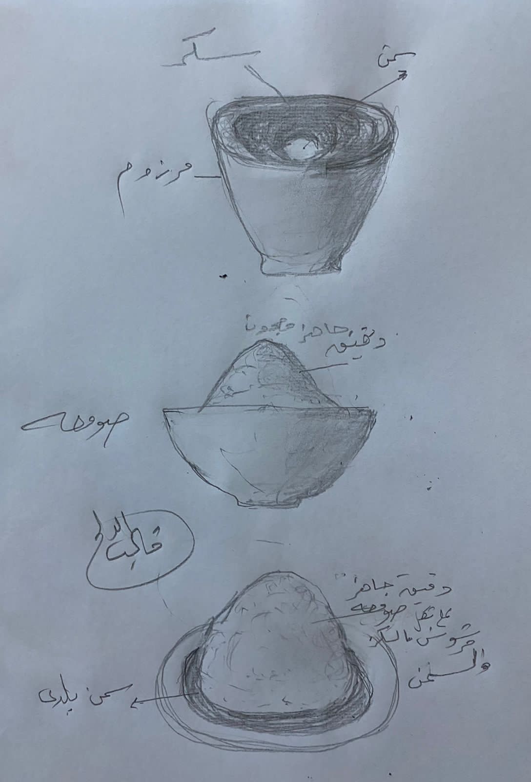 ومن أعماله الظاهرة في افراح القرية في عمل موائد الطعام الشعبية مثل المرزوم والصومعة وهذه الاكلة كمايقول الفنان التشكيلي وخبير التراث الشعبي في المنطقة الاستاذ قالب الدلح تتكون من :