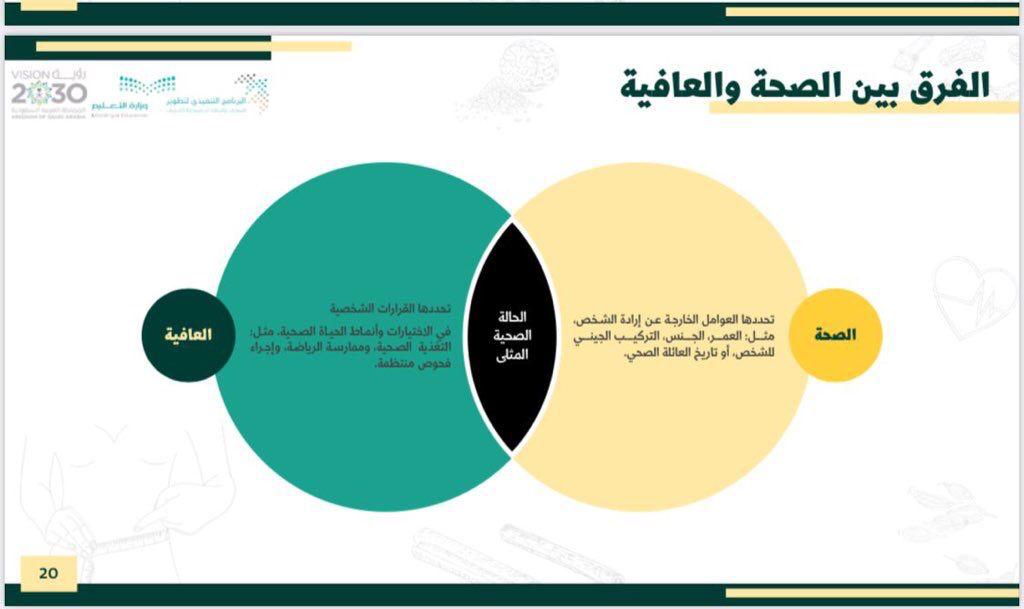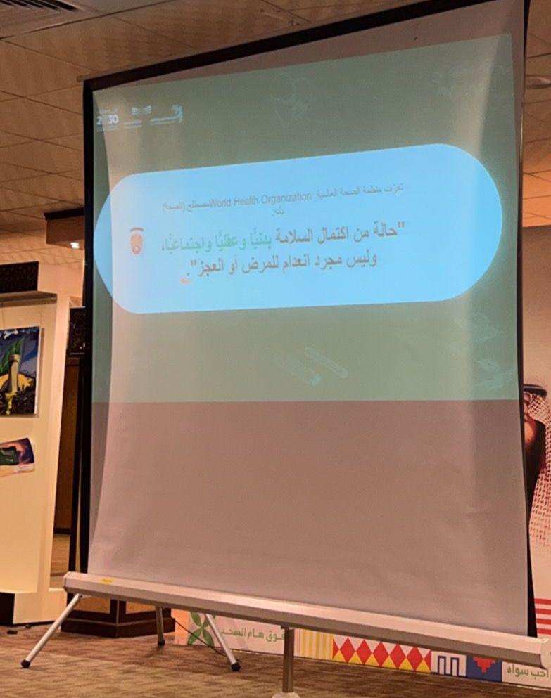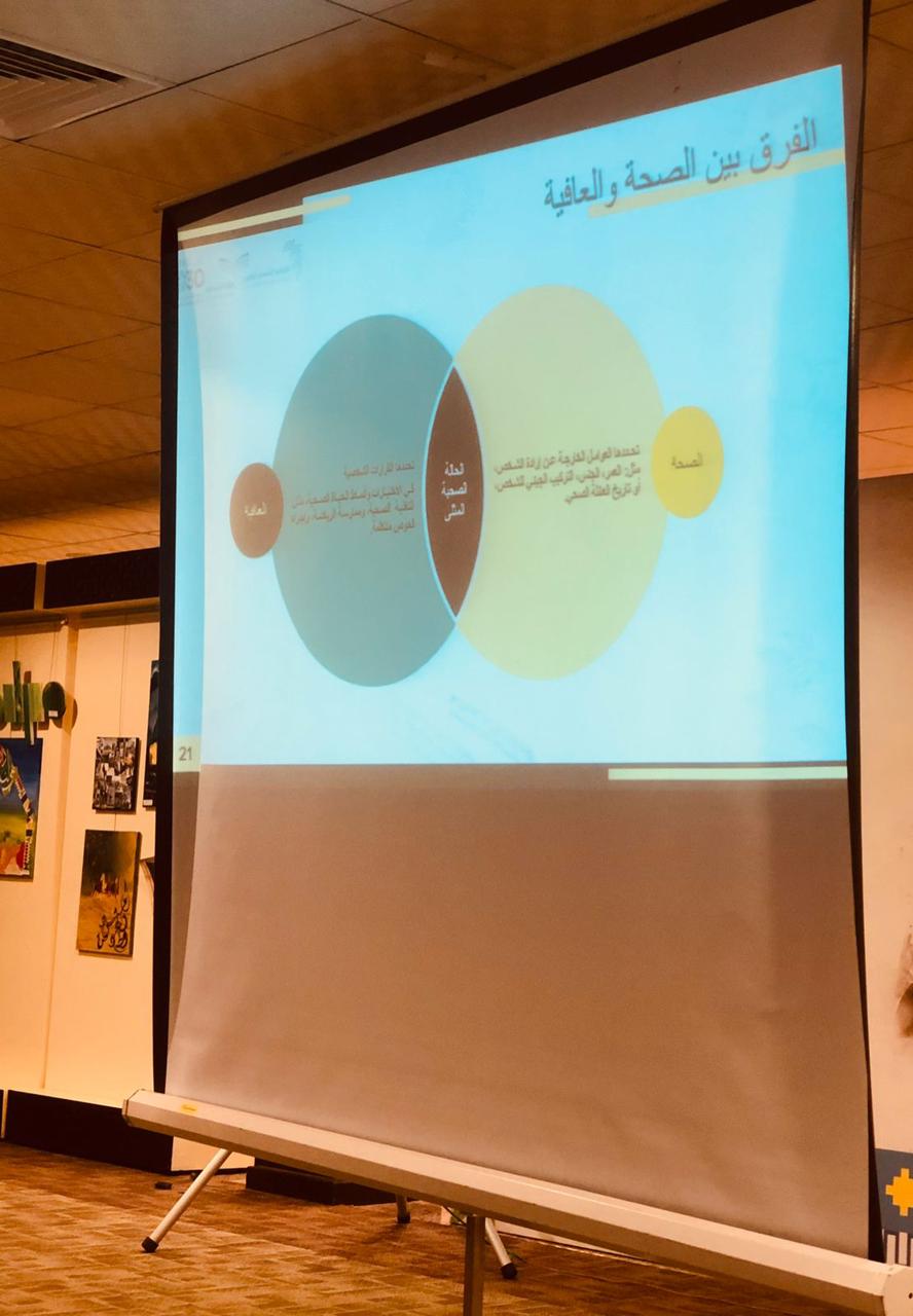 هذا واستعرضت المدربة “العدواني” نبذة عن الثقافة الصحية ، وتوضيح مفهومي الصحة والعافية والفرق بينهما ، تسليط الضوء على أبعاد العافية ، محددات الصحة معدلات الإصابة، والخمول البدني ، المفهوم، التوصيات المحلية والعالمية ، عرض مفهومي النشاط البدني و اللياقة البدنية، النظام الغذائي و السلامة الشخصية، المؤثرات العقلية والصحة النفسية .