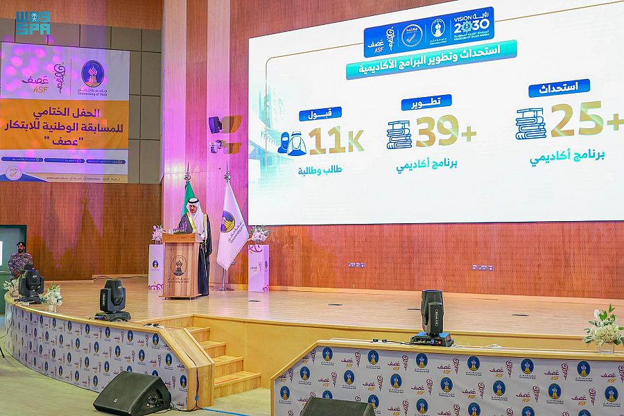 كما ألقى رئيس اللجنة الإشرافية للمسابقة الوطنية للابتكار “عصف” الدكتور سرحان السعيد كلمة بين فيها أن المسابقة تلقت أكثر من 320 فريقًا تمثل أكثر من 10 جامعات سعودية، في مسارات ابتكارية متنوعة، شملت: الابتكار في التقنية، والابتكار في الصحة، والابتكار في الطاقة، والابتكار في السياحة، والابتكار الاجتماعي، والابتكار البرمجي.