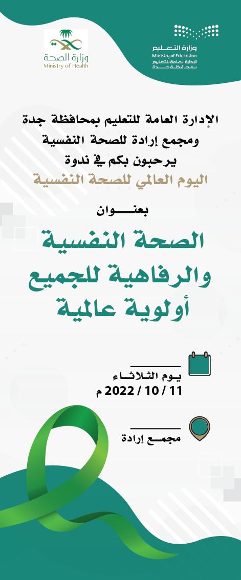 تحت شعار جعل الصحة النفسية والرفاهية للجميع أولوية عالمية دشن مجمع إرادة والصحة النفسية لخدمات إرادة بجدة فعالية اليوم العالمي للصحة النفسية 2022م الذي يصادف العاشر من أكتوبر عبر حملة ومجموعة من الفعاليات والمحاضرات والندوات والمعارض الميدانية الداخلية والخارجية بالتعاون مع العديد من الجهات والمنشآت الحكومية ومنها تعليم جدة والمديرية العامة لحرس الحدود والشؤون الإجتماعية وغيرها بهدف التعريف بشعار العام وأن السعادة والرفاهية هي السلوك الأبرز والأهم في ظل المتغيرات والمؤثرات والتحول الذي يطرأ على الفرد والأسرة والمجتمع والعمل على ترسيخ الخطوات التوعوية والتثقيفية والترفيهية والعلاجية المناسبة لمواكبة المحافظة على الطرق المناسبة لضمان الأمان والإستقرار المجتمعي.