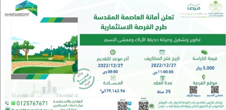 وتضمَّنت الفرص الاستثمارية ، إنشاء وتشغيل وصيانة مشروع مركز لخدمات نقل المركبات ، على مساحة ٦.٣٠٤.٤٣ متراً مربعاً لمدة 25 سنة ، ومشروع تطوير وتشغيل وصيانه حديقة الأراك وممشى النسيم بحي العوالي