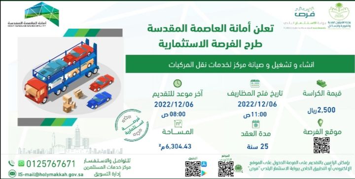 وتضمَّنت الفرص الاستثمارية ، إنشاء وتشغيل وصيانة مشروع مركز لخدمات نقل المركبات ، على مساحة ٦.٣٠٤.٤٣ متراً مربعاً لمدة 25 سنة ، ومشروع تطوير وتشغيل وصيانه حديقة الأراك وممشى النسيم بحي العوالي