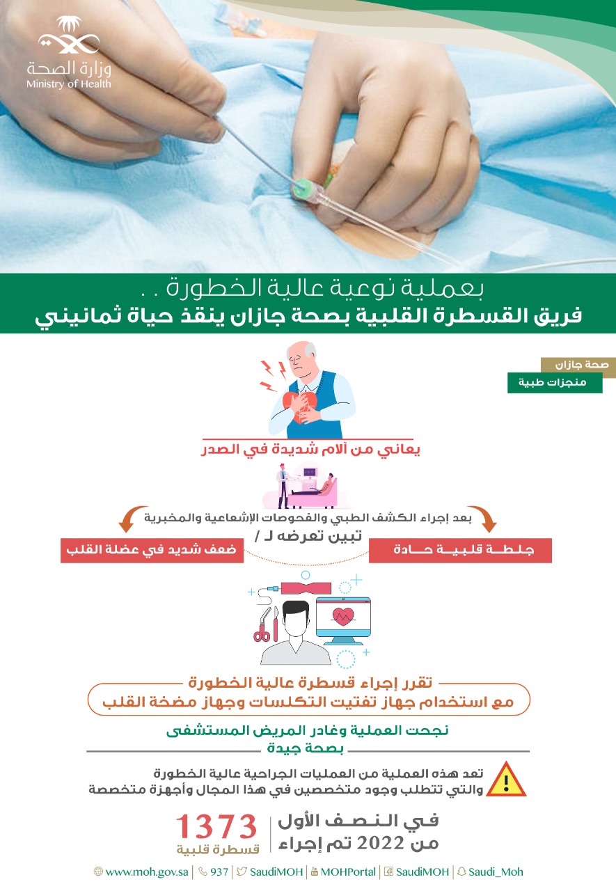 تمكن فريق القسطرة القلبية بصحة جازان من إنقاذ حياة مريض ثمانيني بعد تعرضه لجلطة قلبية حادة وضعف شديد في عضلة القلب