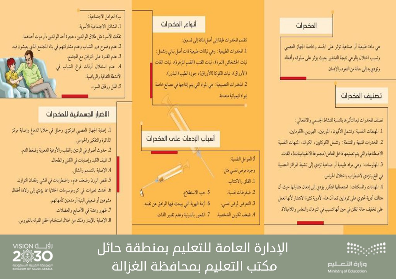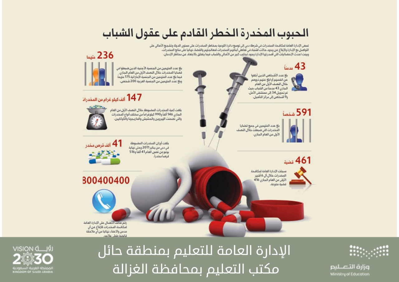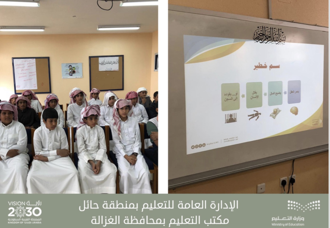ووجه مدير مكتب التعليم بمحافظة الغزالة خالد الثويني قادة المدارس المتوسطة والثانوية بعمل برامج وقائية داخل المدارس للطلاب والطالبات بأضرار آفة المخدرات لوقايتهم وحمايتهم من خطر المخدرات كنوع من العمل الاستباقي قبل أيام الاختبارات في التحذير الوقائي من مروجي وتعاطي المخدرات .