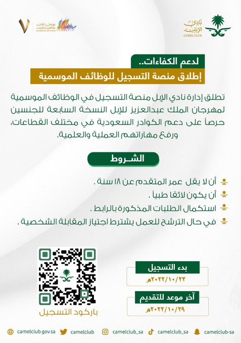 نادي الإبل يعلن مواعيد وشروط التقديم على الوظائف الموسمية لمهرجان الملك عبدالعزيز