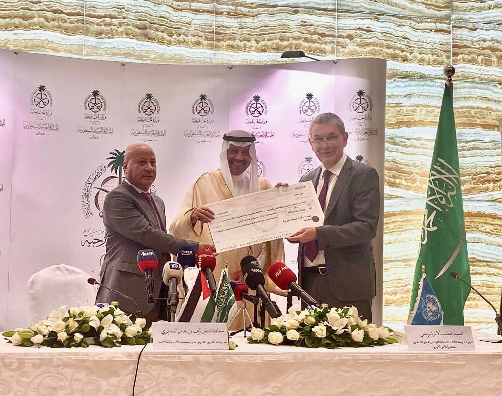 سلم سفير خادم الحرمين الشريفين لدى الأردن نايف بن بندر السديري اليوم المفوض العام لوكالة الأمم المتحدة لإغاثة وتشغيل اللاجئين الفلسطينيين في الشرق الأدنى (الأونروا) فيليب لازاريني، الشيك الذي تقدمه المملكة العربية السعودية لميزانية الوكالة بقيمة 27 مليون دولار أمريكي لدعم برامج الوكالة وعملياتها في المنطقة.