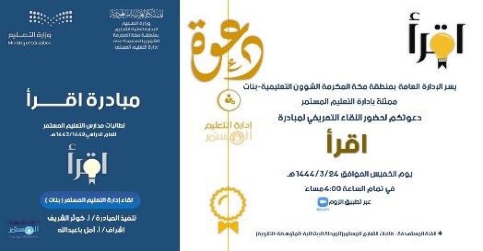 أقامت الإدارة العامة للتعليم بمنطقة مكة المكرمة، ممثلة بإدارة التعليم المستمر، يوم الخميس الموافق 24/3/1444هـ اللقاء التعريفي تحت عنوان (للمبادرة أنا أقرأ) عبر القاعة الافتراضية (zoom ) بحضور مساعدة المدير العام للشؤون التعليمية الأستاذة/ لمياء بنت عبدالعزيز بشاوري، وبإشراف مديرة إدارة التعليم المستمر دلال اللحياني ومسؤولة المبادرة بإدارة المشرفة التربوية أمل باعبدالله، وتكاملية من قبل المشرفة التربوية وداد المحمادي ومنسقة المبادرة مديرة ب تك 3 كوثر الشريف ومنظمة المبادرة رضى السهيمي .