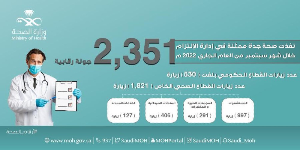 و عدد الزيارات على منشآت القطاع الصحي الخاص ب1821 زيارة منها 997 زيارة للمستشفيات،و291 زيارة و للمجمعات الطبية العامة و الخاصة و المختبرات ، و406 زيارة لقطاع الصيدليات،و127 زيارة للخدمات المساندة.