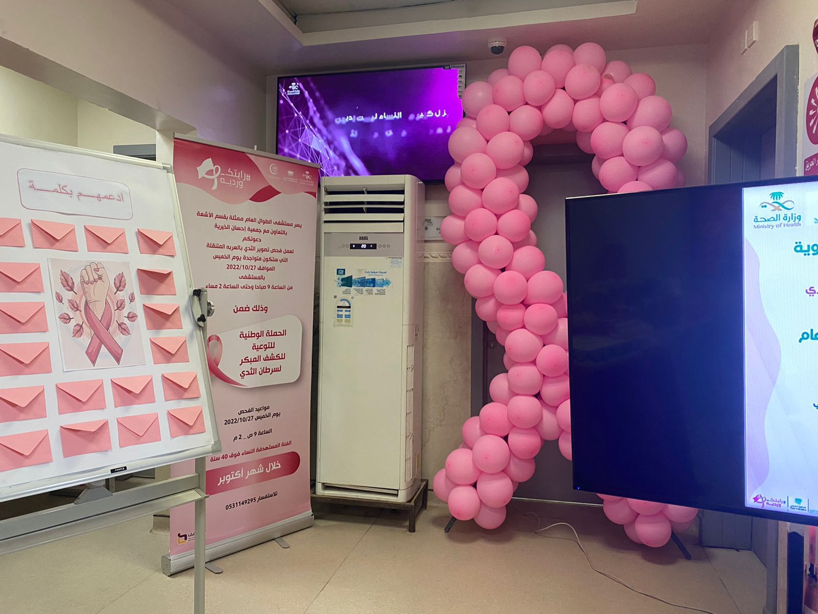 نفذ مستشفى الطوال العام بالتعاون مع جمعية “إحسان” الطبية الخيرية فعالية الشهر العالمي لسرطان الثدي – أكتوبر 2022 وأهمية الفحص المبكر وذلك للتوعية بالمرض الذي يُعد من أكثر الأنواع انتشارًا وكذلك التوعية بضرورة الوقاية والكشف المبكر لمكافحته