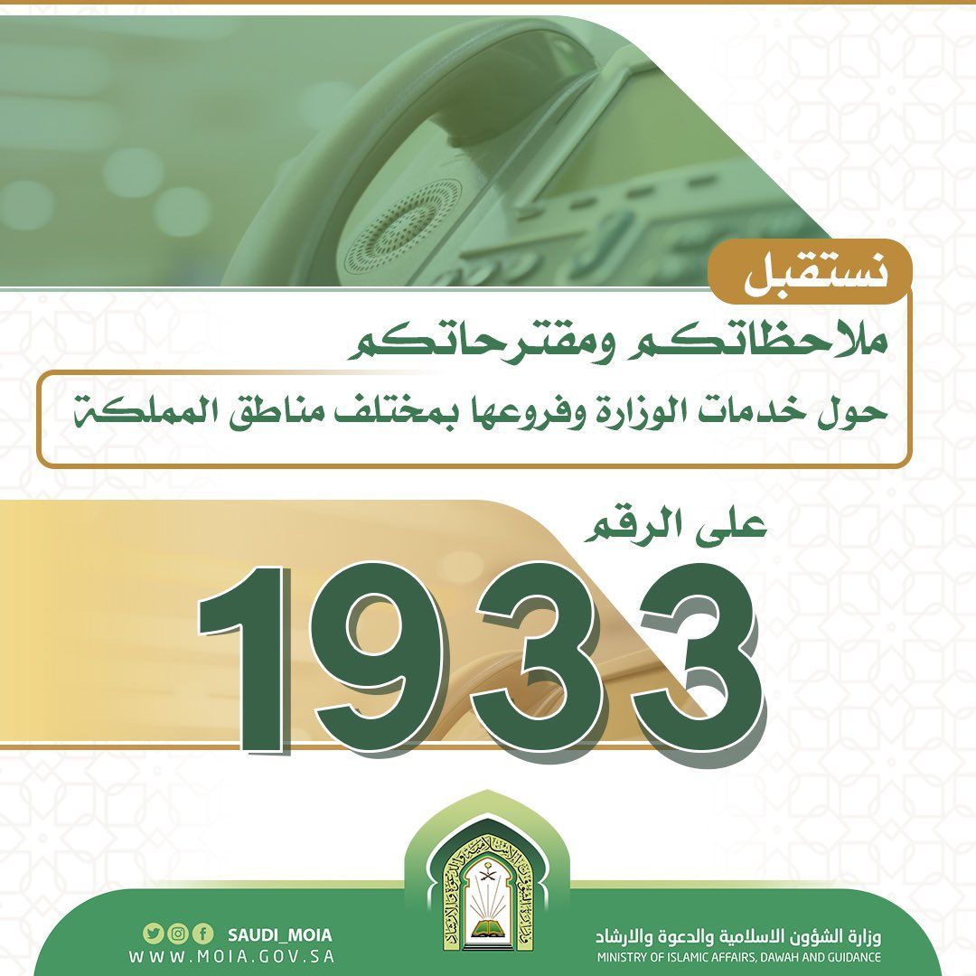 مما يذكر أن مركز خدمة الاتصال الموحد “1933” أطلقه معالي الوزير الشيخ الدكتور عبداللطيف بن عبدالعزيز آل الشيخ بتاريخ 15/2/1440هـ، في إطار جهود الوزارة لتعزيز التواصل مع المجتمع عبر الاتصال المباشر للارتقاء بمستوى الخدمة التي تقدمها مختلف قطاعات الوزارة وفروعها لبيوت الله وجمعيات تحفيظ القرآن الكريم والدعوة إلى الله وفق منهج الوسطية والاعتدال، ولتطوير العمل بالوزارة في جميع ما تقدمه من خدمات للتيسير على المواطنين وراحتهم في التواصل عن بعد مع جميع قطاعاتها؛ تحقيقاً لتطلعات القيادة الرشيدة، وبما يتفق مع رؤية المملكة 2030.