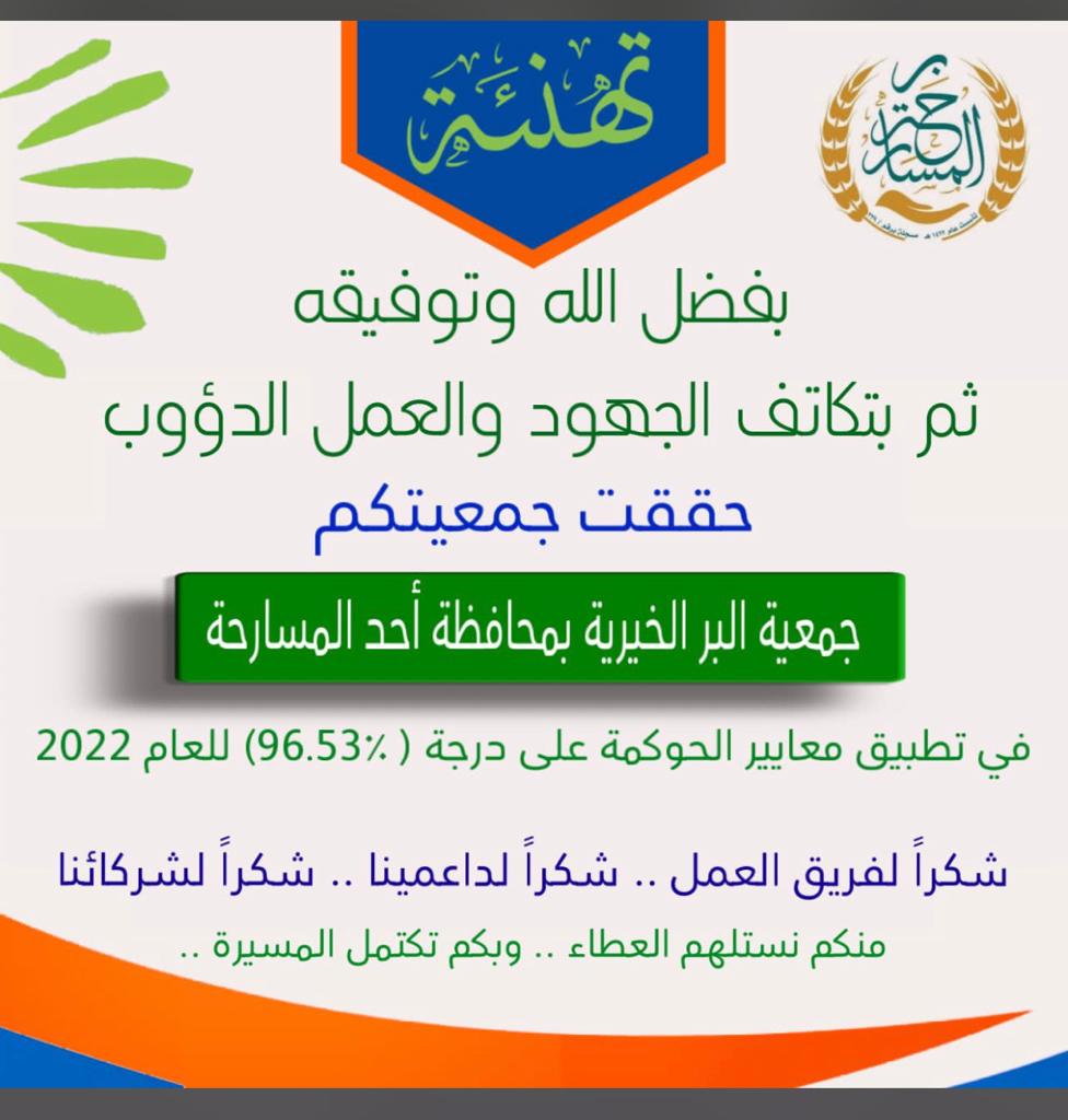 يتقدم فريق رائدات احد المسارحة التطوعي بقيادة الاستاذة جبارة محنشي بأرقى التهاني و التبريكات لمنسوبي و منسوبات جمعية البر الخيرية بأحد المسارحة بمناسبة حصولها على درجة ( 96.53 ٪ ) في تطبيق معايير الحوكمة للعام 2021 متمنيه لهم دوام التوفيق ومواصله مسيره التميز والعطاء.