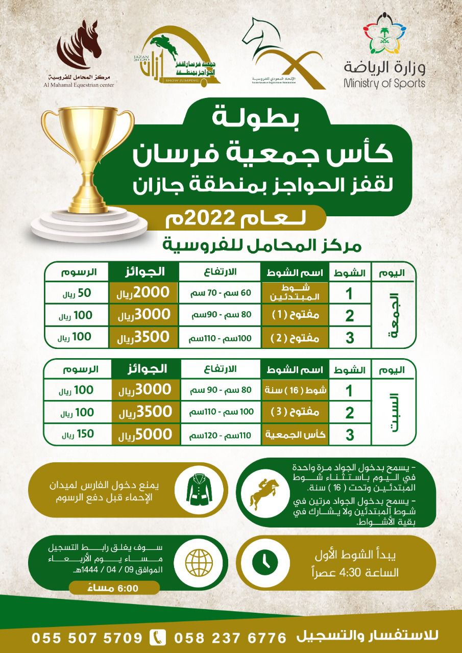 تنطلق مساء اليوم بطولة كأس جمعية فرسان لقفز الحواجز بمنطقة جازان لعام 2022 م، والمقامة بمركز المحامل للفروسية بمحافظة أحد المسارحة بإشراف من الاتحاد السعودي للفروسية، وفرع وزارة الرياضة بالمنطقة .