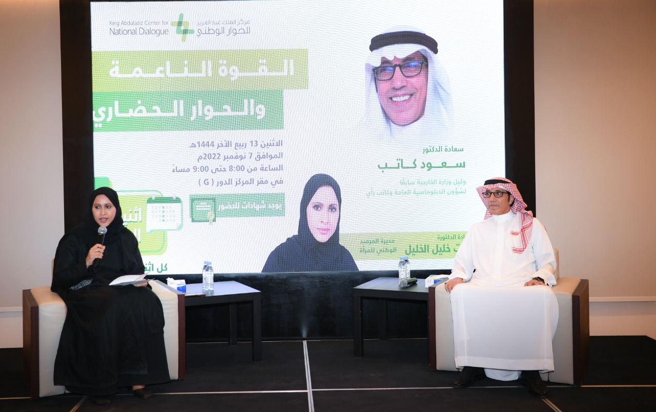 نظم مركز الملك عبدالعزيز للحوار الوطني اثنينه الحوار بعنوان “القوة الناعمة والحوار الحضاري” مساء الإثنين، 13ربيع الآخر 1444هـ، الموافق 7 نوفمبر 2022، واستضاف خلالها الدكتور/ سعود كاتب، وكيل وزارة الخارجية سابقاً لشؤون الدبلوماسية العامة، كاتب رأي.