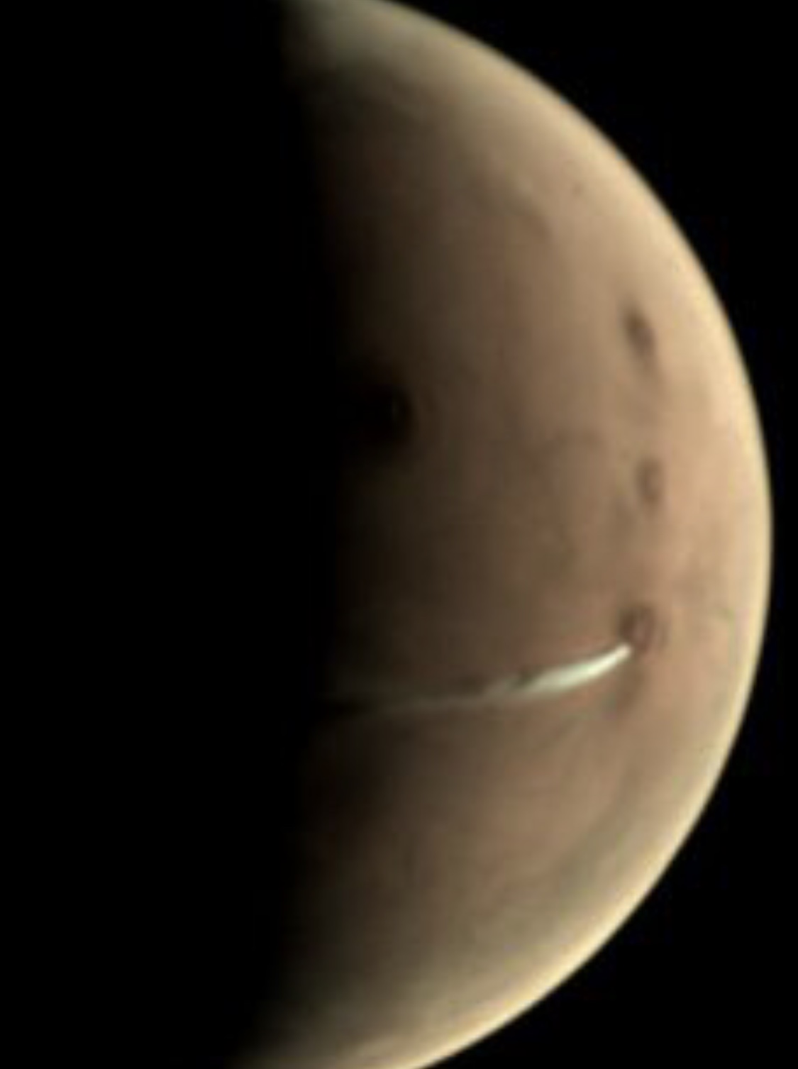 يتتبع العلماء سحابة بيضاء غريبة ظهرت على سطح المريخ، ويبلغ حجمها حوالي 900 ميل (1500 كم)، وتقع بالقرب من خط استواء الكوكب بالقرب من بركان أرسيا مونس، ولم يكن هناك بركان نشط على سطح المريخ خلال نصف القرن الماضي، لذا فإن علماء وكالة الفضاء الأوروبية على يقين من أنه لا علاقة للسحابة بأي نوع من الثوران البركاني.