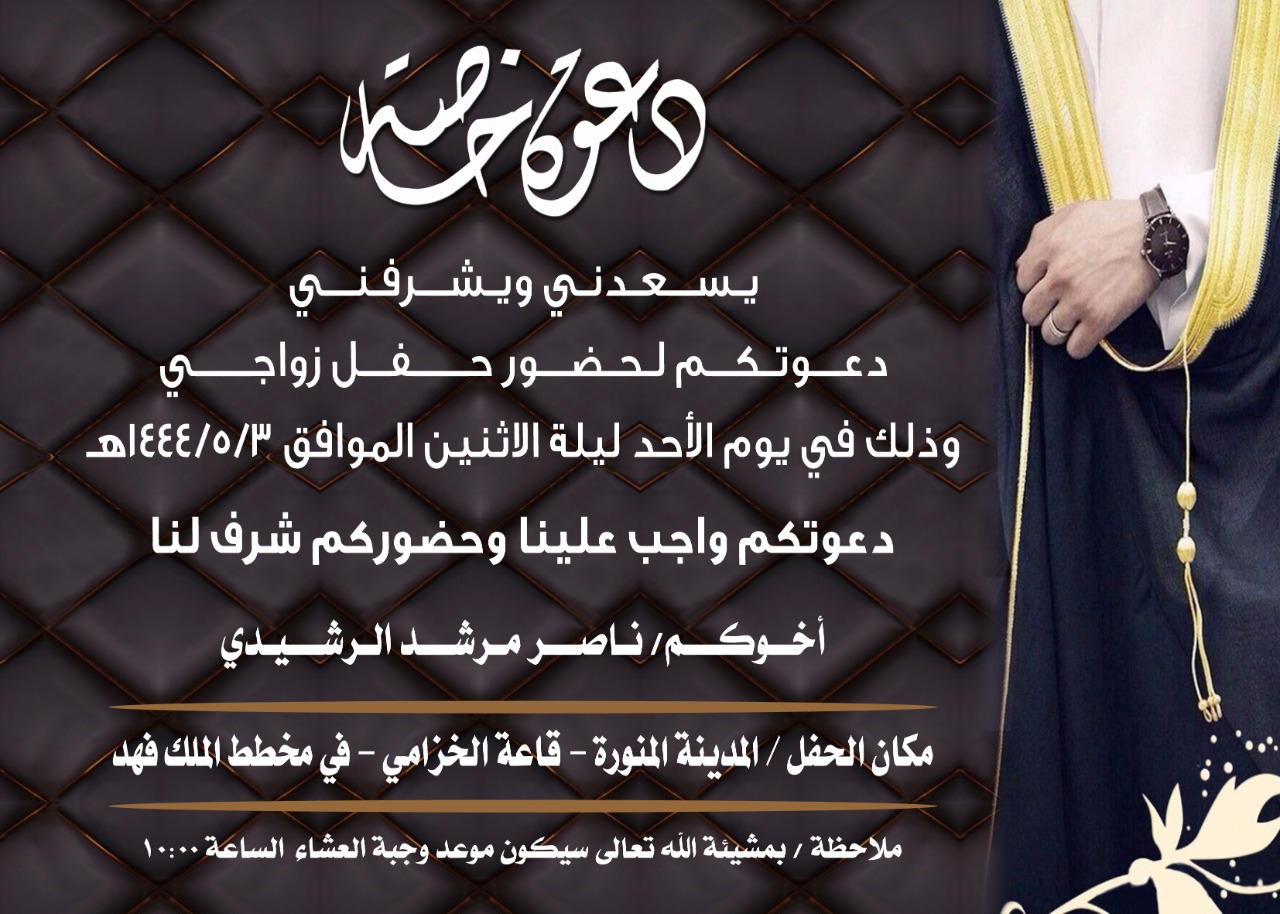 دعوة لحضور حفل زواج “ناصر بن مرشد الرشيدي” في قاعة الخزامي في مخطط الملك فهد بالمدينة