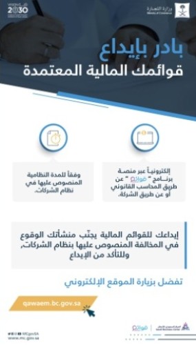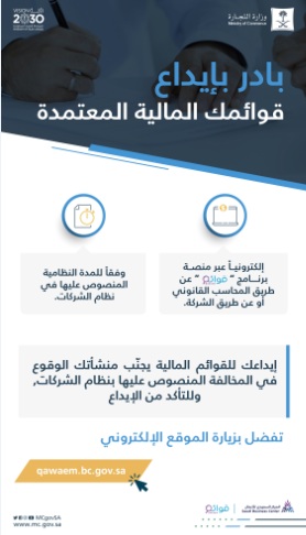 دعت وزارة التجارة الشركات إلى الالتزام بإيداع قوائمها المالية المعتمدة عبر برنامج الإيداع الإلكتروني “قوائم” من خلال مكاتب المحاسبة القانونية المرخصة أو عن طريقة الشركة عبر الموقع الإلكتروني qawaem.bc.gov.sa ، وذلك تحقيقاً لمبادئ الحوكمة والشفافية بين الشركات والجهات الحكومية ذات العلاقة وجهات التمويل والمساهمين والمستثمرين.