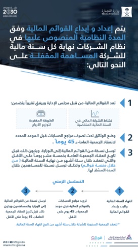 وأوضحت “التجارة” آليات إعداد الوثائق المالية لشركات المساهمة المقفلة حيث يُعد مجلس الإدارة القوائم المالية للشركة وتقرير عن نشاطها ومركزها المالية عن السنة المنقضية، ويضمن هذا التقرير الطريقة المقترحة لتوزيع الأرباح، بالإضافة إلى وضع الوثائق تحت تصرف مراجع الحسابات قبل الموعد المحدد لانعقاد الجمعية العامة بـ 45 يوماً.