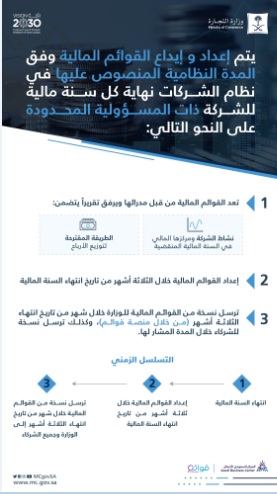 كما يُعد المديرون في الشركات ذات المسؤولية المحدودة عن كل سنة مالية القوائم المالية للشركة وتقريراً عن نشاط الشركة ومركزها المالي واقتراحاتهم في شأن توزيع الأرباح، وذلك خلال ثلاثة أشهر من نهاية السنة المالية.