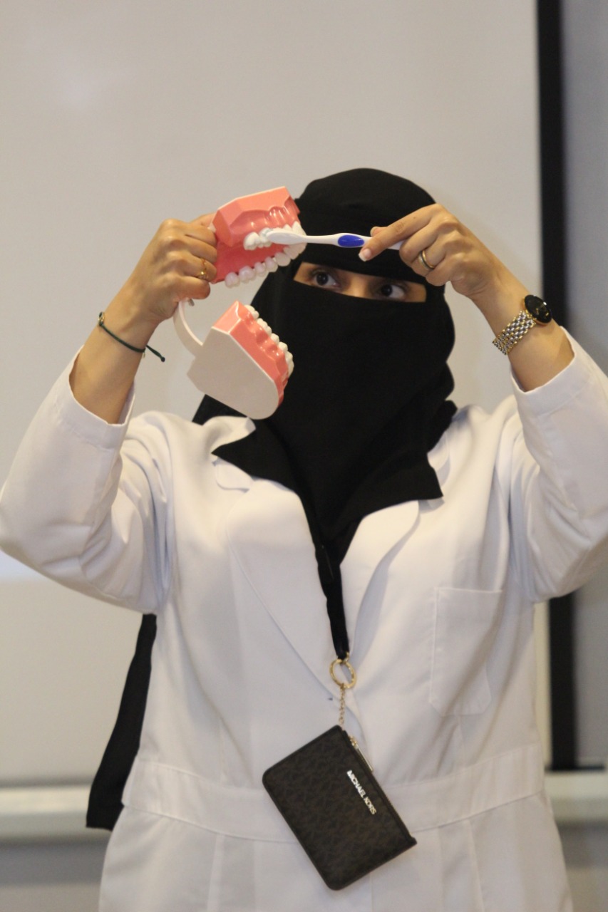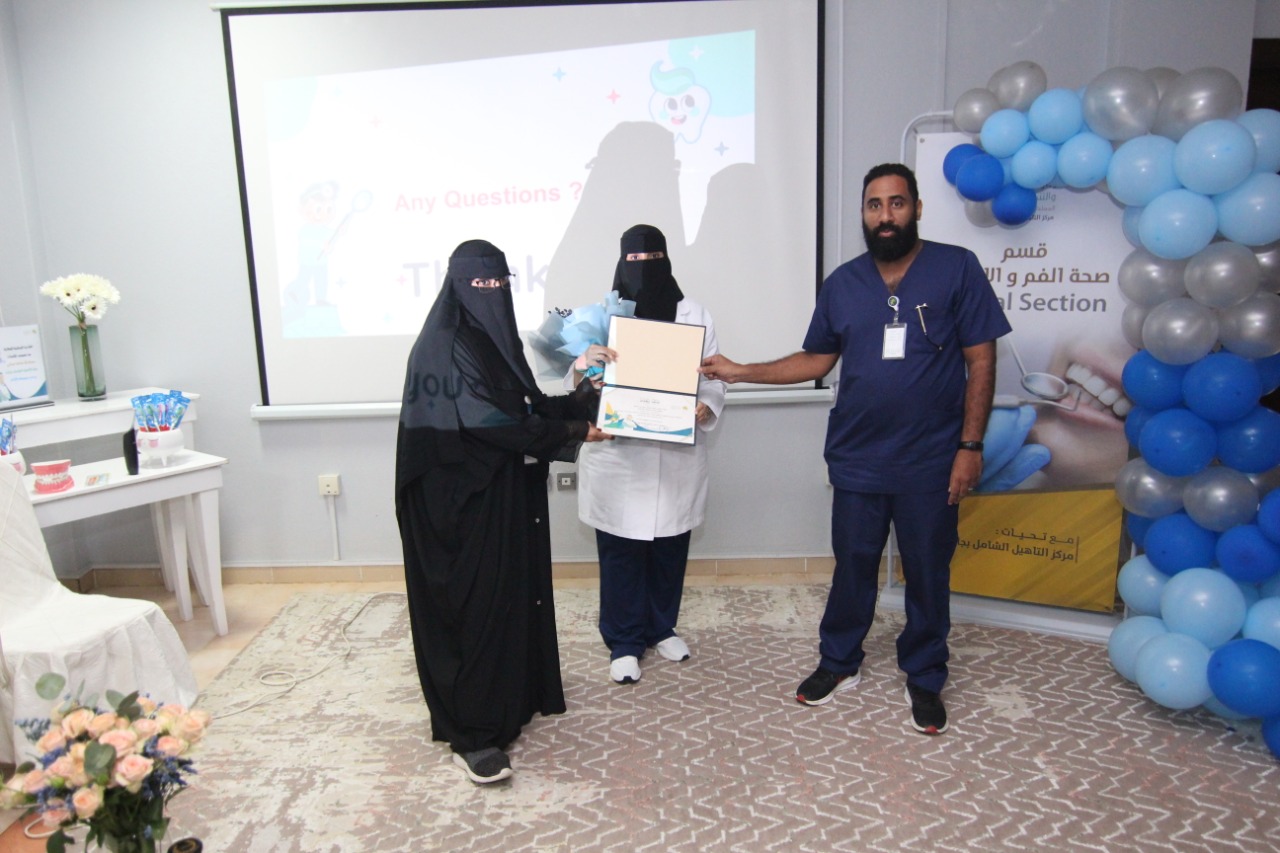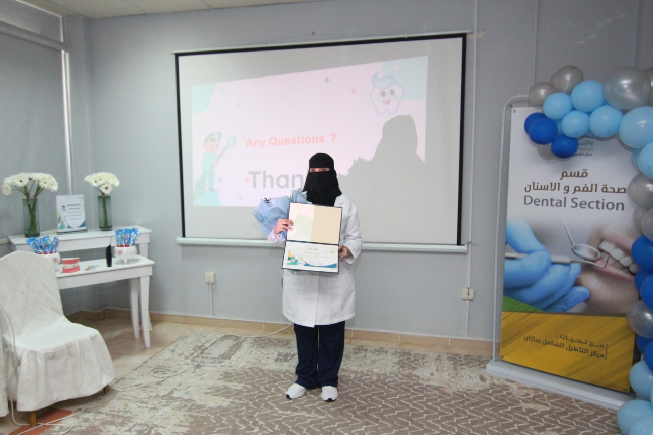 نفذ القسم الطبي ممثلاً بعيادة الفم والاسنان بمركز التأهيل الشامل للذكور بجازان محاضرة طبية بعنوان صحتي في نظافة اسناني قدمتها الاخصائية بمركز طب الاسنان التخصصي بجازان الدكتورة هدى حكمي، حيث استهدفت بها عمال ومشرفي العناية الشخصية والطاقم التمريضي ومنسوبي قسم الخدمات الاجتماعية، والتي تهدف إلى رفع مستوى المعلومات لدى المشرفين بصورة خاصة على الخدمات المقدمة للمستفيدين بالمركز من الأشخاص ذوي الإعاقة، وتطرقت الدكتورة في محاضرتها إلى عدد من المحاور منها خطوات تفريش الاسنان، خيط الأسنان وفوائد وطريقة استخدامه ، غسول الفم ودورة في الوقاية والعلاج ، العمر الافتراضي لتجهيزات العناية بالأسنان، الفرشاة الكهربائية ما لها وما عليها، وختمت حديثها بأهمية الزيارات الدورية لطبيب الاسنان بمعدل زيارة كل 6 أشهر لما لها م دور هام في اكتشاف أي مشكلة من بدايتها ومعالجتها قبل تكبر.