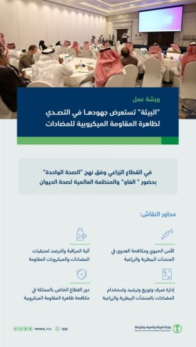 وأكدت الورشة سعي الوزارة بالتعاون مع الجهات ذات العلاقة للتصدي لهذه الظاهرة في قطاعي الصحة الحيوانية والنباتية باستخدام نهج (الصحة الواحدة)، عبر تطوير التشريعات واللوائح والسياسات الخاصة بتداول واستخدام مضادات الميكروبات، وتطوير المعايير الصحية للإنتاج الحيواني والنباتي، وتحسين تطبيقات الأمن الحيوي في المنشآت الحيوانية والبيطرية والنباتية على طول سلاسل الإمداد مما سيساهم في حمايتها واستدامتها، والتأكد من الاستخدام الأمثل لمضادات الميكروبات في الصحة الحيوانية والنباتية، وتعزيز القدرات الوطنية المخبرية للترصد للميكروبات المقاومة في صحة الحيوان والنبات وبيئتهما المشتركة، والرقابة الصحية على المنتجات الزراعية، والتأكد من مطابقتها للمواصفات القياسية للأغذية وبخاصة الحدود الميكروبية المسموح بها، وخلوها من بقايا العوامل المضادة للميكروبات المستخدمة في العلاج، والاستمرار في بناء شراكات وتواصل فعال مع الجهات الحكومية والخاصة للتصدي لهذه الظاهرة، والتأكيد على رفع الوعي لدى جميع أصحاب العلاقة بالاستخدام الرشيد لمضادات الميكروبات وخطورة ظاهرة الميكروبات المقاومة للمضادات.