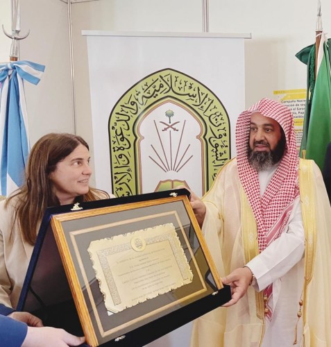 وتسلم درعين من الحكومة الارجنتينية نيابة عن معالي وزير الشؤون الإسلامية والدعوة والإرشاد رئيس مجلس أمناء مركز الملك فهد الثقافي الإسلامي الشيخ الدكتور عبداللطيف بن عبدالعزيز آل الشيخ وكيل الوزارة للشؤون الإسلامية الشيخ عواد بن سبتي العنزي، حيث قدمت الدر ع الأول معالي وزير النقل لحكومة بيونس آيرس السيدة مانويلا مندوسا، فيما قدم الدرع الثاني وكيل وزارة الصحة الأرجنتيي السيد جابريل باتيستيلي وبحضور سفير خادم الحرمين الشريفين لدى جمهورية الأرجنتين الأستاذ حسين العسيري. ومدير المركز الأستاذ نايف الفعيم.